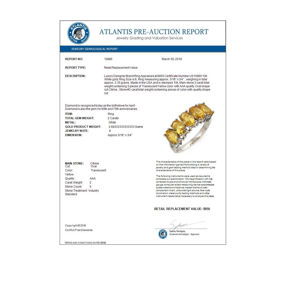 REF-14T2M -10860 ---- 2.0 CTW Citrine Ring 10K White Gold ---- Luxury Designer Brand Ring Appraised at $850 Certificate Number US10860 10k White gold, Ring Size is 6, Ring measuring approx. 3/16" x 3/4" , weighing in total approx. 2.35 grams. Made in the USA and is stamped 10k, Main stone 2 carat total weight containing 5 pieces of Translucent Yellow color with AAA quality Oval shape cut Citrine , Stone #2 carat total weight containing pieces of color with quality shape cut