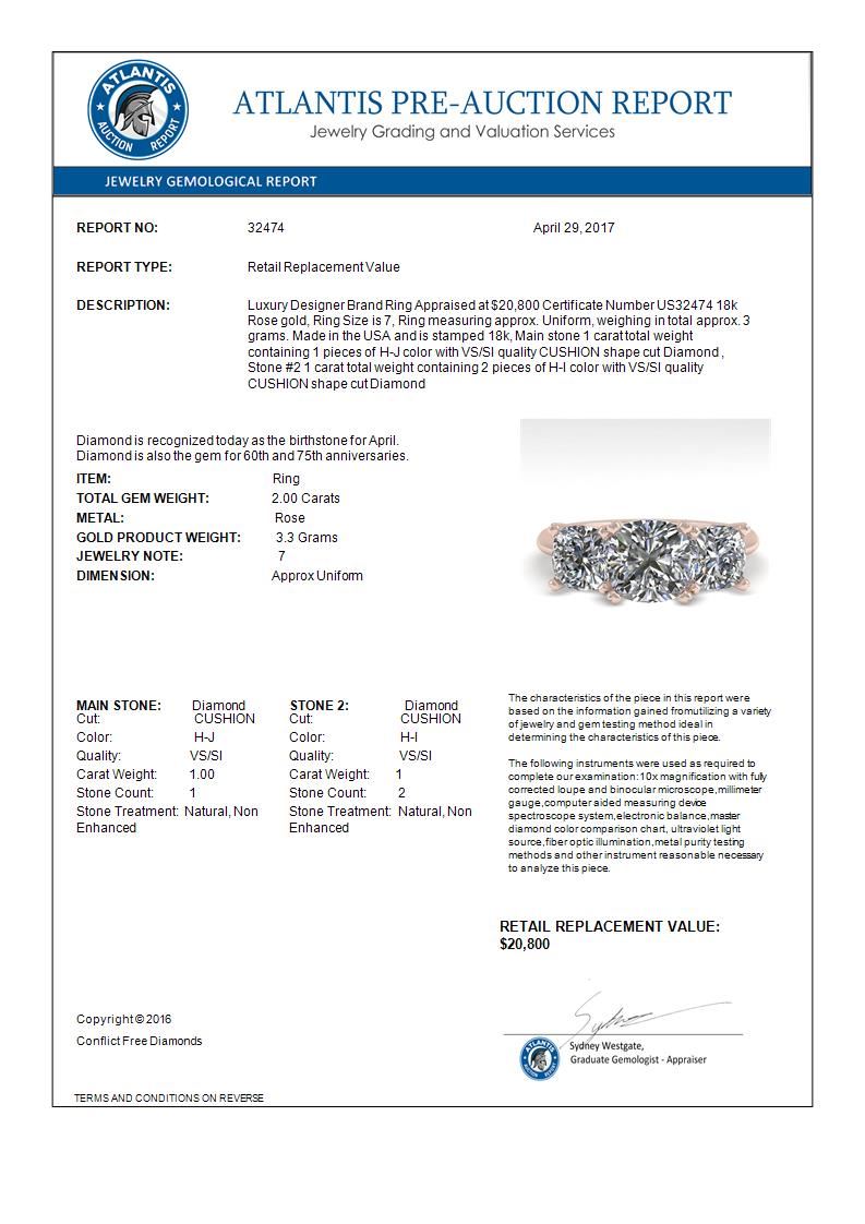 2.0 CTW Cushion Cut VS/SI Diamond 3 Stone Designer Ring 18K Rose Gold ---- Luxury Designer Brand Ring Appraised Retail Price at $20,800 ---- SKU Number US32474 18k Rose gold Ring Size is 7, Ring measuring approx. Uniform, weighing in total approx. 3 grams. Made in the USA and is stamped 18k, Main stone 1.00 carat total weight containing 1 pieces of H-J color with VS/SI quality CUSHION shape cut Diamond , Stone #2 1 carat total weight containing 2 pieces of H-I color with VS/SI quality CUSHION shape cut