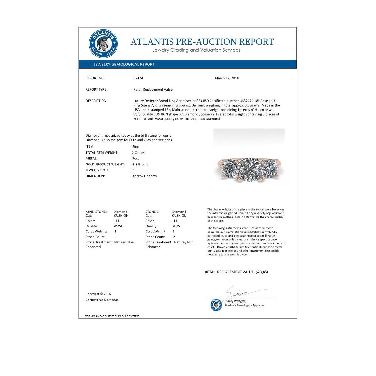 REF-447W2F -32474 ---- 2.0 CTW Cushion Cut VS/SI Diamond 3 Stone Designer Ring 18K Rose Gold ---- Luxury Designer Brand Ring Appraised at $23,850 Certificate Number US32474 18k Rose gold, Ring Size is 7, Ring measuring approx. Uniform, weighing in total approx. 3.5 grams. Made in the USA and is stamped 18k, Main stone 1 carat total weight containing 1 pieces of H-J color with VS/SI quality CUSHION shape cut Diamond , Stone #2 1 carat total weight containing 2 pieces of H-I color with VS/SI quality CUSHION shape cut Diamond