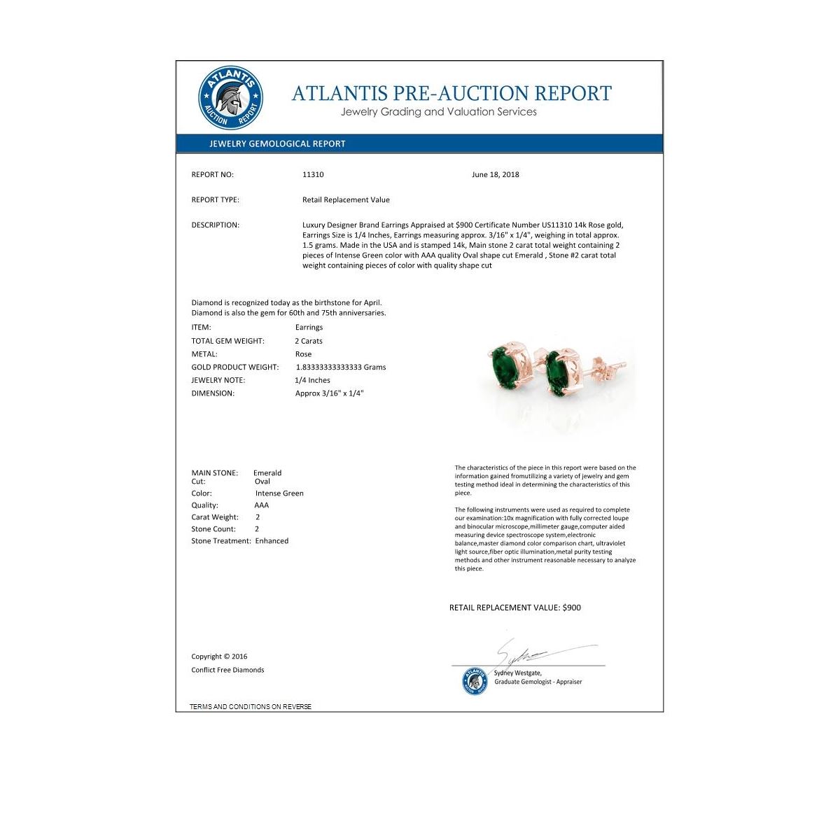 REF-13X6T -11310 ---- 2.0 CTW Emerald Earrings 14K Rose Gold ---- Luxury Designer Brand Earrings Appraised at $900 Certificate Number US11310 14k Rose gold, Earrings Size is 1/4 Inches, Earrings measuring approx. 3/16" x 1/4", weighing in total approx. 1.5 grams. Made in the USA and is stamped 14k, Main stone 2 carat total weight containing 2 pieces of Intense Green color with AAA quality Oval shape cut Emerald , Stone #2 carat total weight containing pieces of color with quality shape cut