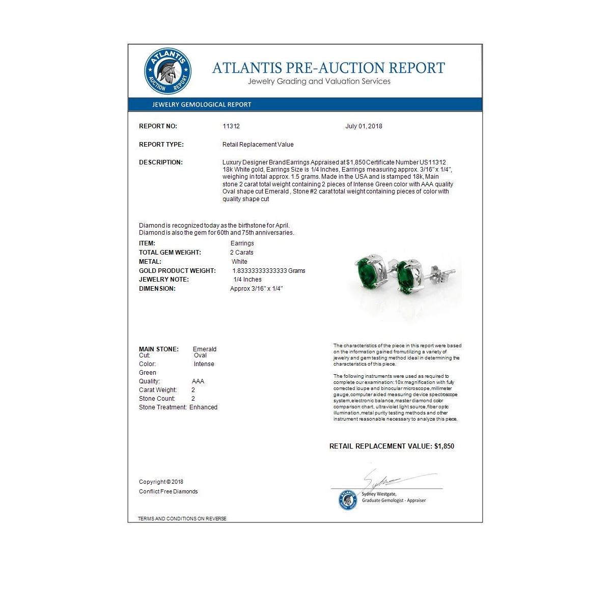 REF-28H2A -11312 ---- 2.0 CTW Emerald Earrings 18K White Gold ---- Luxury Designer Brand Earrings Appraised at $1,850 Certificate Number US11312 18k White gold, Earrings Size is 1/4 Inches, Earrings measuring approx. 3/16" x 1/4", weighing in total approx. 1.5 grams. Made in the USA and is stamped 18k, Main stone 2 carat total weight containing 2 pieces of Intense Green color with AAA quality Oval shape cut Emerald , Stone #2 carat total weight containing pieces of color with quality shape cut