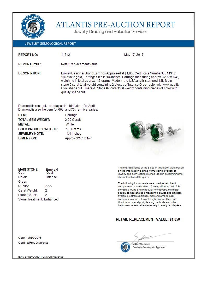 2.0 CTW Emerald Earrings 18K White Gold ---- Luxury Designer Brand Earrings Appraised Retail Price at $1,850 ---- SKU Number US11312 18k White gold Earrings Size is 1/4 Inches, Earrings measuring approx. 3/16" x 1/4", weighing in total approx. 1.5 grams. Made in the USA and is stamped 18k, Main stone 2 carat total weight containing 2 pieces of Intense Green color with AAA quality Oval shape cut Emerald , Stone #2 carat total weight containing pieces of color with quality shape cut