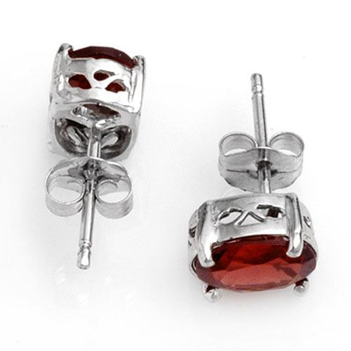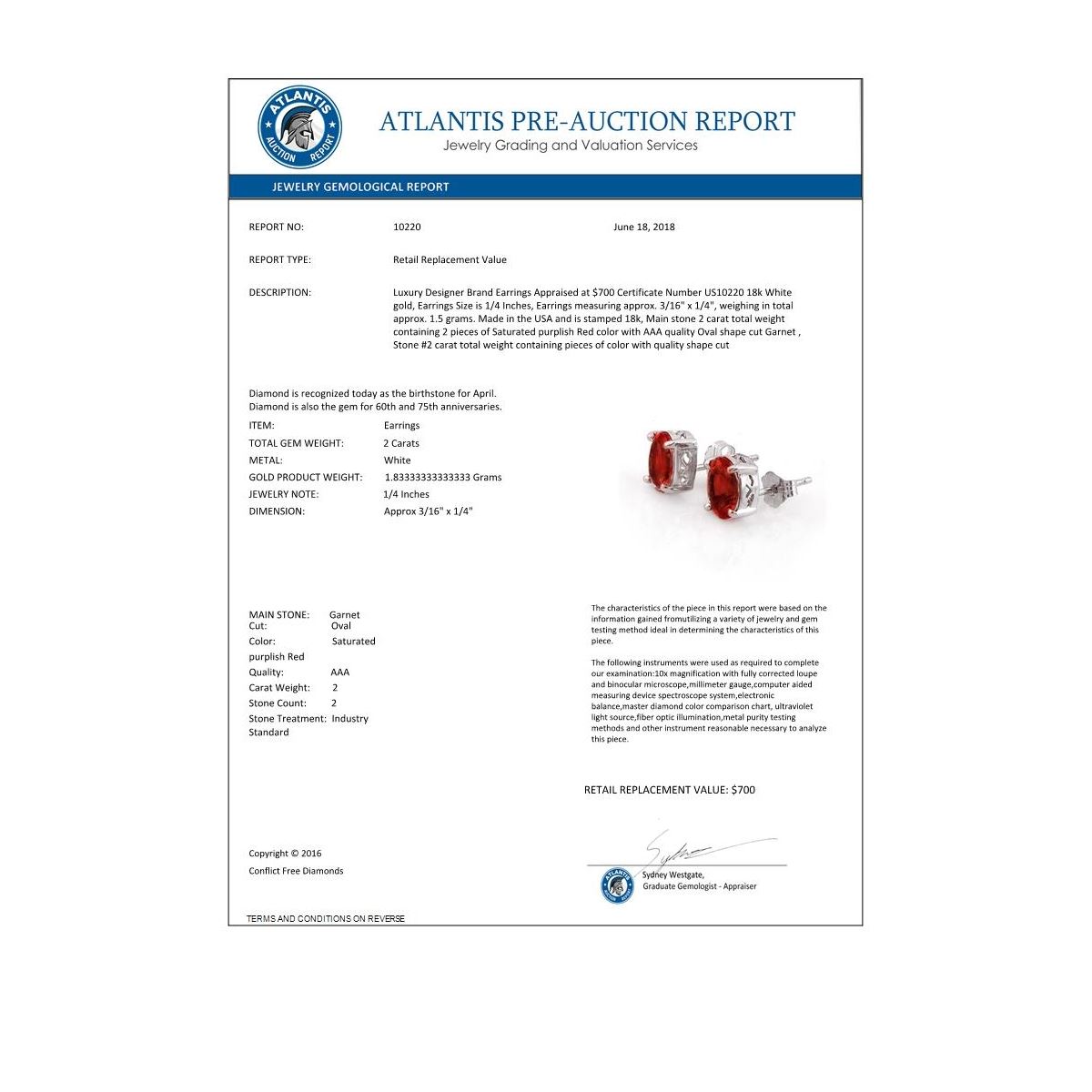 REF-11Y8K -10220 ---- 2.0 CTW Garnet Earrings 18K White Gold ---- Luxury Designer Brand Earrings Appraised at $700 Certificate Number US10220 18k White gold, Earrings Size is 1/4 Inches, Earrings measuring approx. 3/16" x 1/4", weighing in total approx. 1.5 grams. Made in the USA and is stamped 18k, Main stone 2 carat total weight containing 2 pieces of Saturated purplish Red color with AAA quality Oval shape cut Garnet , Stone #2 carat total weight containing pieces of color with quality shape cut