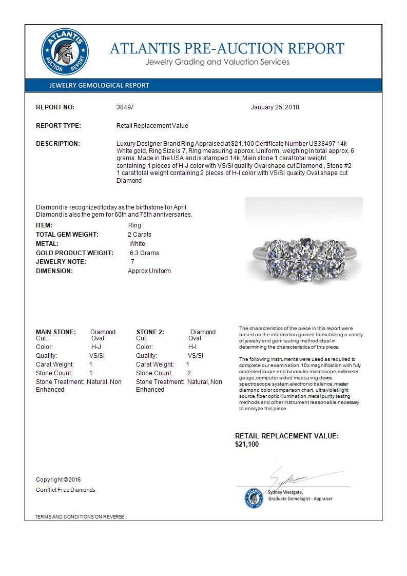 REF-395X8T -38497 ---- 2.0 CTW Oval Cut VS/SI Diamond 3 Stone Designer Ring 14K White Gold ---- Luxury Designer Brand Ring Appraised at $21,100 Certificate Number US38497 14k White gold, Ring Size is 7, Ring measuring approx. Uniform, weighing in total approx. 6 grams. Made in the USA and is stamped 14k, Main stone 1 carat total weight containing 1 pieces of H-J color with VS/SI quality Oval shape cut Diamond , Stone #2 1 carat total weight containing 2 pieces of H-I color with VS/SI quality Oval shape cut Diamond