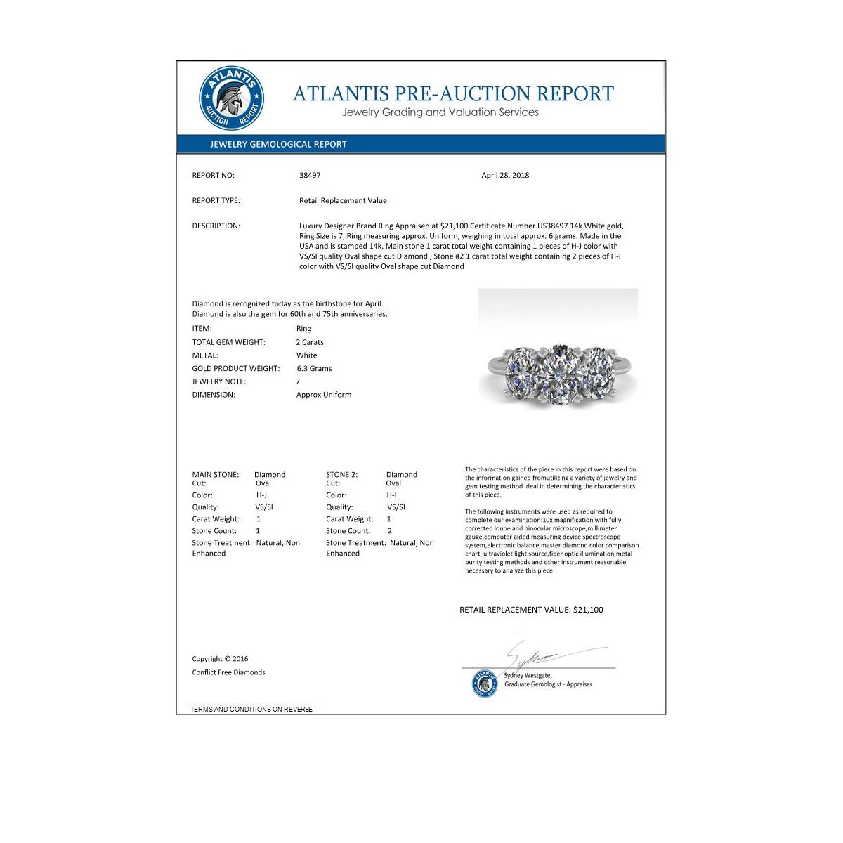 REF-395X8T -38497 ---- 2.0 CTW Oval Cut VS/SI Diamond 3 Stone Designer Ring 14K White Gold ---- Luxury Designer Brand Ring Appraised at $21,100 Certificate Number US38497 14k White gold, Ring Size is 7, Ring measuring approx. Uniform, weighing in total approx. 6 grams. Made in the USA and is stamped 14k, Main stone 1 carat total weight containing 1 pieces of H-J color with VS/SI quality Oval shape cut Diamond , Stone #2 1 carat total weight containing 2 pieces of H-I color with VS/SI quality Oval shape cut Diamond
