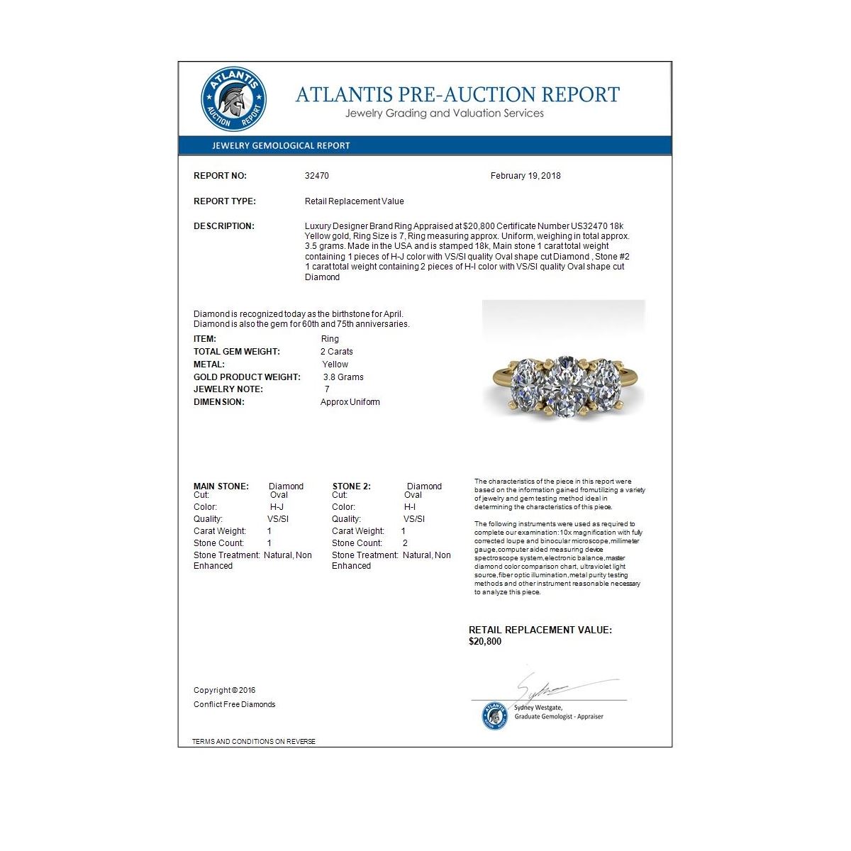 REF-390F2N -32470 ---- 2.0 CTW Oval Cut VS/SI Diamond 3 Stone Designer Ring 18K Yellow Gold ---- Luxury Designer Brand Ring Appraised at $20,800 Certificate Number US32470 18k Yellow gold, Ring Size is 7, Ring measuring approx. Uniform, weighing in total approx. 3.5 grams. Made in the USA and is stamped 18k, Main stone 1 carat total weight containing 1 pieces of H-J color with VS/SI quality Oval shape cut Diamond , Stone #2 1 carat total weight containing 2 pieces of H-I color with VS/SI quality Oval shape cut Diamond