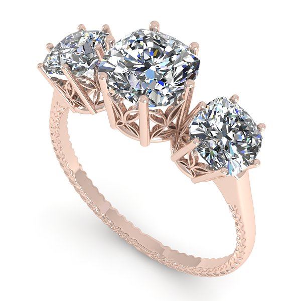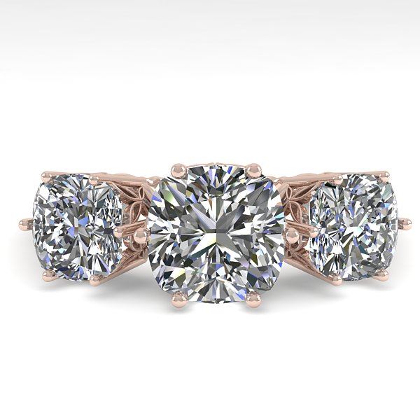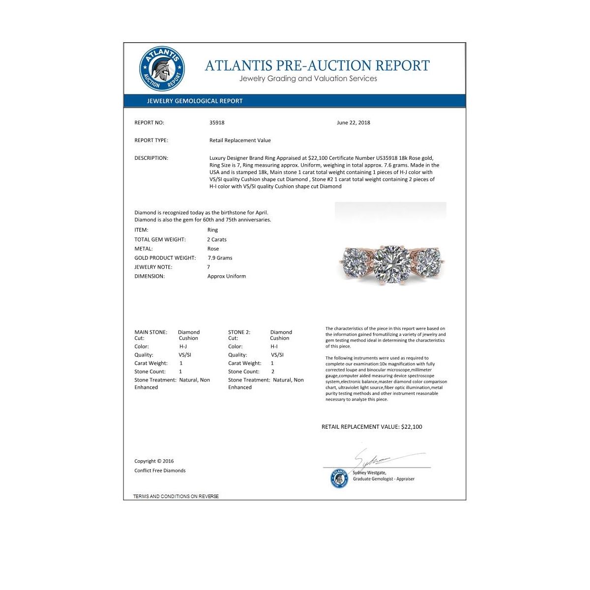 REF-414N2Y -35918 ---- 2.0 CTW Past Present Future Certified VS/SI Cushion Diamond Ring 18K Rose Gold ---- Luxury Designer Brand Ring Appraised at $22,100 Certificate Number US35918 18k Rose gold, Ring Size is 7, Ring measuring approx. Uniform, weighing in total approx. 7.6 grams. Made in the USA and is stamped 18k, Main stone 1 carat total weight containing 1 pieces of H-J color with VS/SI quality Cushion shape cut Diamond , Stone #2 1 carat total weight containing 2 pieces of H-I color with VS/SI quality Cushion shape cut Diamond