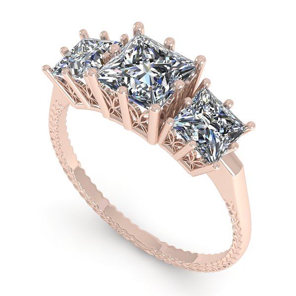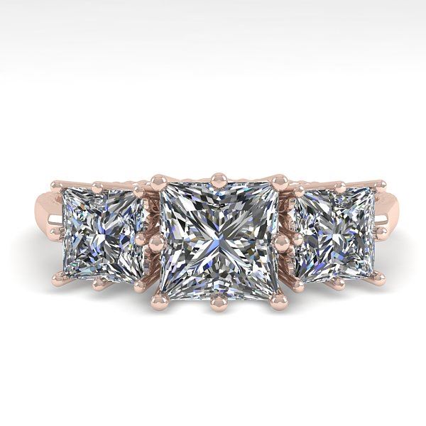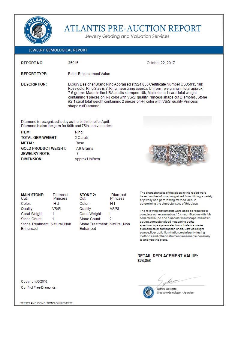 REF-414M2H -35915 ---- 2.0 CTW Past Present Future VS/SI Princess Diamond Ring 18K Rose Gold ---- Luxury Designer Brand Ring Appraised at $24,850 Certificate Number US35915 18k Rose gold, Ring Size is 7, Ring measuring approx. Uniform, weighing in total approx. 7.6 grams. Made in the USA and is stamped 18k, Main stone 1 carat total weight containing 1 pieces of H-J color with VS/SI quality Princess shape cut Diamond , Stone #2 1 carat total weight containing 2 pieces of H-I color with VS/SI quality Princess shape cut Diamond