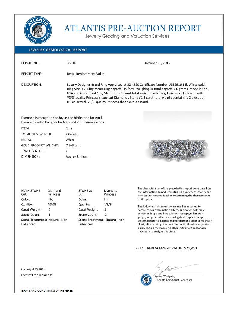35916 - REF-414W2H ---- 2.0 CTW Past Present Future VS/SI Princess Diamond Ring 18K White Gold ---- Luxury Designer Brand Ring Appraised at $24,850 Certificate Number US35916 18k White gold, Ring Size is 7, Ring measuring approx. Uniform, weighing in total approx. 7.6 grams. Made in the USA and is stamped 18k, Main stone 1 carat total weight containing 1 pieces of H-J color with VS/SI quality Princess shape cut Diamond , Stone #2 1 carat total weight containing 2 pieces of H-I color with VS/SI quality Princess shape cut Diamond
