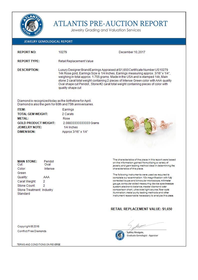 REF-23K3W -10279 ---- 2.0 CTW Peridot Solitaire Stud Earrings 14K Rose Gold ---- Luxury Designer Brand Earrings Appraised at $1,650 Certificate Number US10279 14k Rose gold, Earrings Size is 1/4 Inches, Earrings measuring approx. 3/16" x 1/4", weighing in total approx. 1.755 grams. Made in the USA and is stamped 14k, Main stone 2 carat total weight containing 2 pieces of Intense Green color with AAA quality Oval shape cut Peridot , Stone #2 carat total weight containing pieces of color with quality shape cut