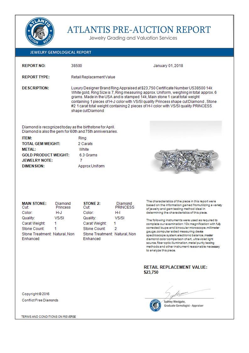 REF-395W8F -38500 ---- 2.0 CTW Princess VS/SI Diamond 3 Stone Designer Ring 14K White Gold ---- Luxury Designer Brand Ring Appraised at $23,750 Certificate Number US38500 14k White gold, Ring Size is 7, Ring measuring approx. Uniform, weighing in total approx. 6 grams. Made in the USA and is stamped 14k, Main stone 1 carat total weight containing 1 pieces of H-J color with VS/SI quality Princess shape cut Diamond , Stone #2 1 carat total weight containing 2 pieces of H-I color with VS/SI quality PRINCESS shape cut Diamond