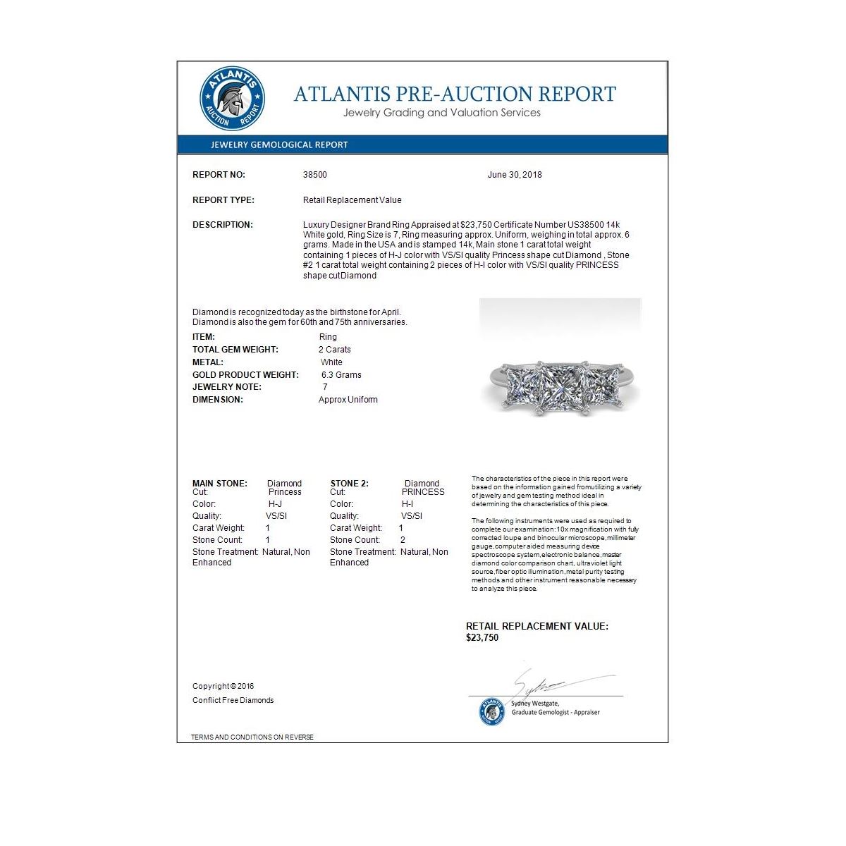 REF-395W8F -38500 ---- 2.0 CTW Princess VS/SI Diamond 3 Stone Designer Ring 14K White Gold ---- Luxury Designer Brand Ring Appraised at $23,750 Certificate Number US38500 14k White gold, Ring Size is 7, Ring measuring approx. Uniform, weighing in total approx. 6 grams. Made in the USA and is stamped 14k, Main stone 1 carat total weight containing 1 pieces of H-J color with VS/SI quality Princess shape cut Diamond , Stone #2 1 carat total weight containing 2 pieces of H-I color with VS/SI quality PRINCESS shape cut Diamond