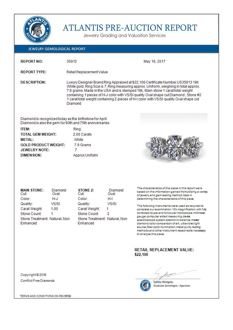 2.0 CTW Solitaire Past Present Future VS/SI Oval Diamond Ring 18K White Gold ---- Luxury Designer Brand Ring Appraised Retail Price at $22,100 ---- SKU Number US35913 18k White gold Ring Size is 7, Ring measuring approx. Uniform, weighing in total approx. 7.6 grams. Made in the USA and is stamped 18k, Main stone 1.00 carat total weight containing 1 pieces of H-J color with VS/SI quality Oval shape cut Diamond , Stone #2 1 carat total weight containing 2 pieces of H-I color with VS/SI quality Oval shape cut