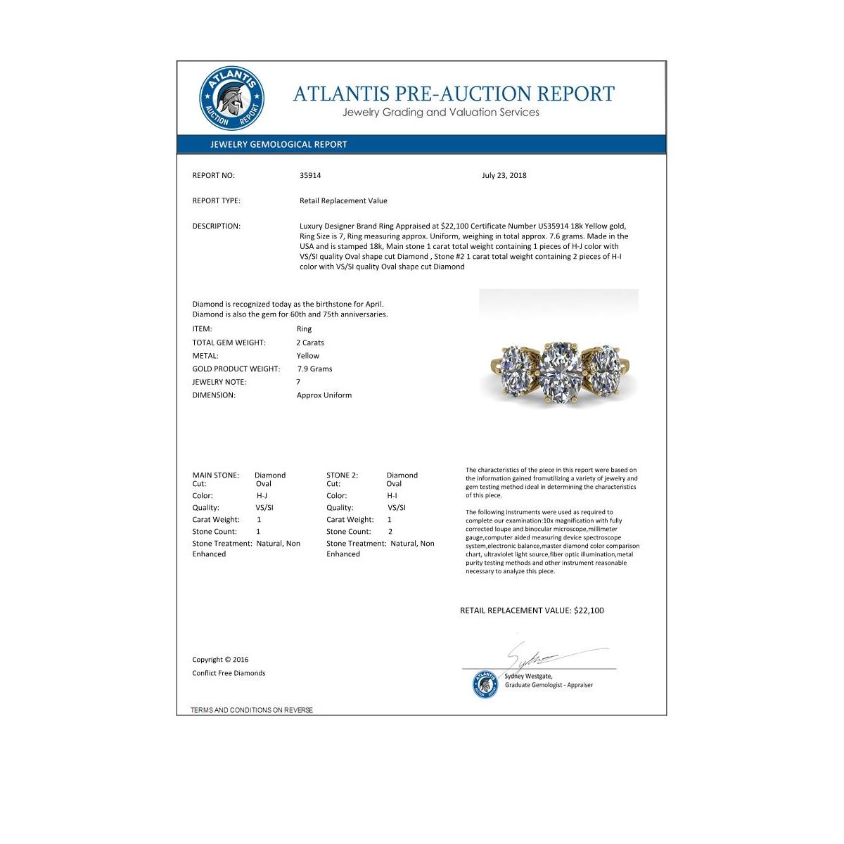 REF-414F3N -35914 ---- 2.0 CTW Solitaire Past Present Future VS/SI Oval Diamond Ring 18K Yellow Gold ---- Luxury Designer Brand Ring Appraised at $22,100 Certificate Number US35914 18k Yellow gold, Ring Size is 7, Ring measuring approx. Uniform, weighing in total approx. 7.6 grams. Made in the USA and is stamped 18k, Main stone 1 carat total weight containing 1 pieces of H-J color with VS/SI quality Oval shape cut Diamond , Stone #2 1 carat total weight containing 2 pieces of H-I color with VS/SI quality Oval shape cut Diamond