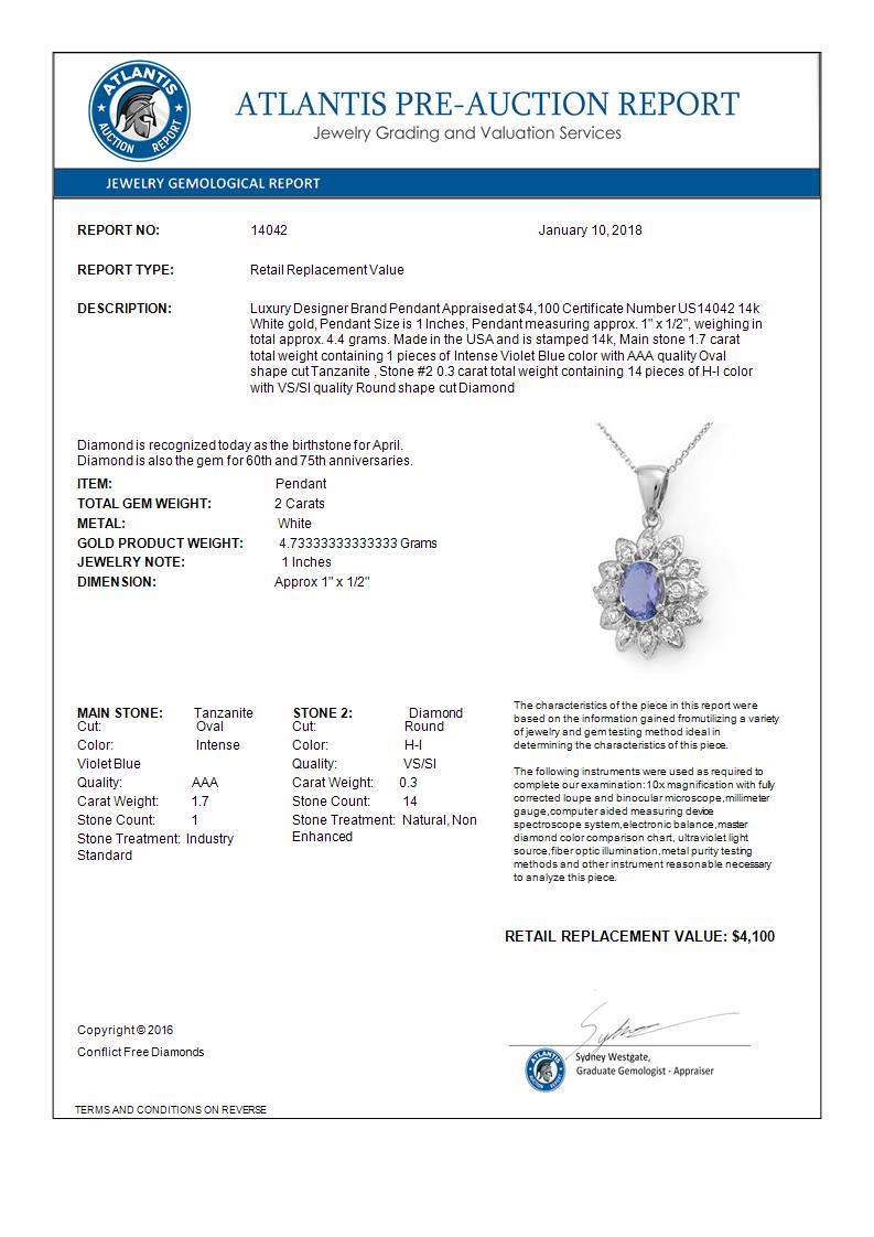 REF-57W3F -14042 ---- 2.0 CTW Tanzanite & Diamond Pendant 14K White Gold ---- Luxury Designer Brand Pendant Appraised at $4,100 Certificate Number US14042 14k White gold, Pendant Size is 1 Inches, Pendant measuring approx. 1" x 1/2", weighing in total approx. 4.4 grams. Made in the USA and is stamped 14k, Main stone 1.7 carat total weight containing 1 pieces of Intense Violet Blue color with AAA quality Oval shape cut Tanzanite , Stone #2 0.3 carat total weight containing 14 pieces of H-I color with VS/SI quality Round shape cut Diamond
