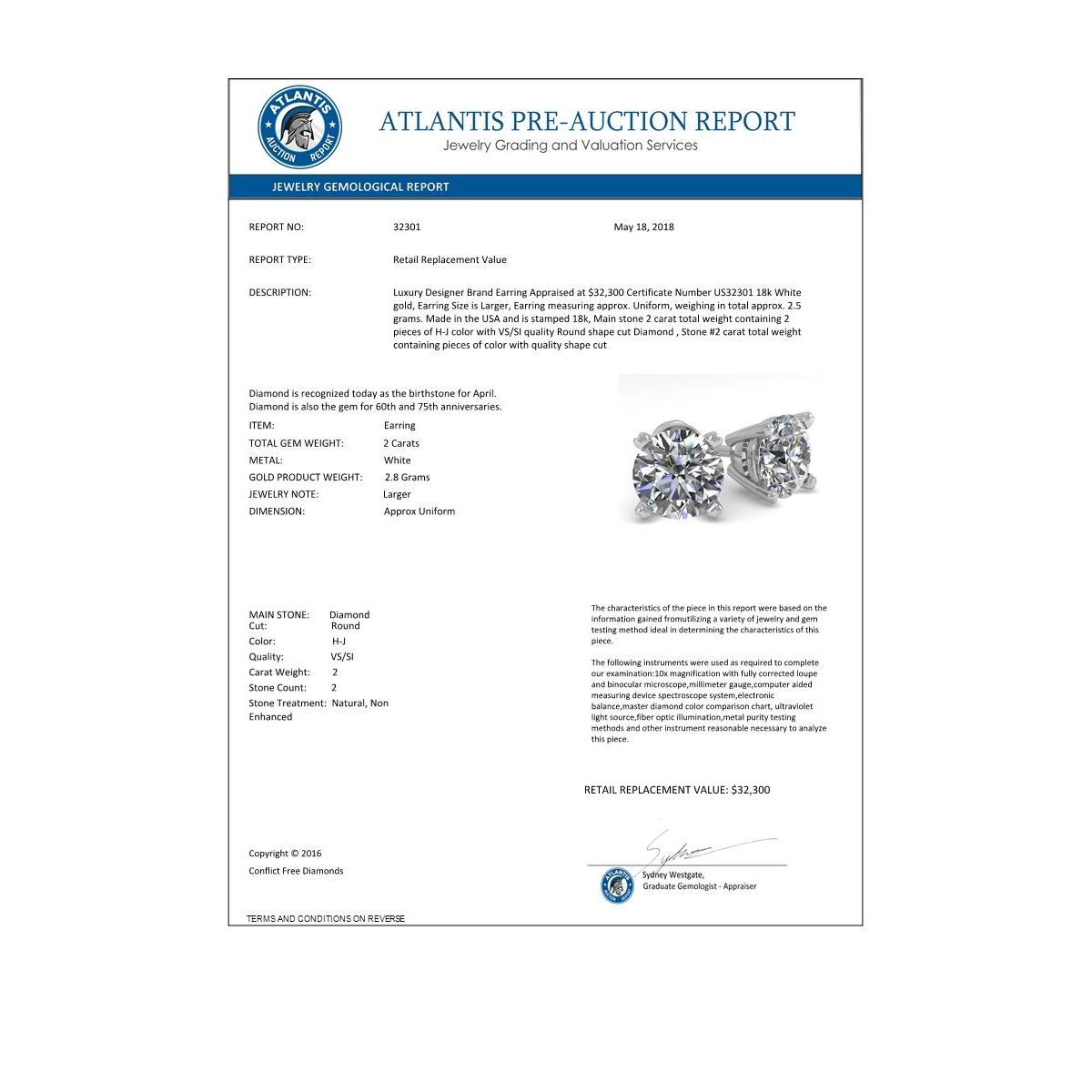 REF-538N3Y -32301 ---- 2.0 CTW VS/SI Diamond Stud Designer Earrings 18K White Gold ---- Luxury Designer Brand Earring Appraised at $32,300 Certificate Number US32301 18k White gold, Earring Size is Larger, Earring measuring approx. Uniform, weighing in total approx. 2.5 grams. Made in the USA and is stamped 18k, Main stone 2 carat total weight containing 2 pieces of H-J color with VS/SI quality Round shape cut Diamond , Stone #2 carat total weight containing pieces of color with quality shape cut