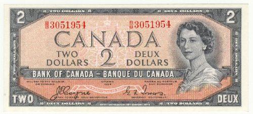 Bank of Canada; $2.00 1954 Devil's Face, BC-30a, UNC, signature; Coyne Towers, serial; B/B3051954.
