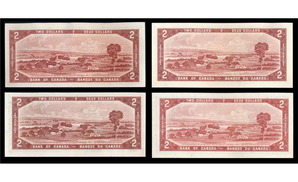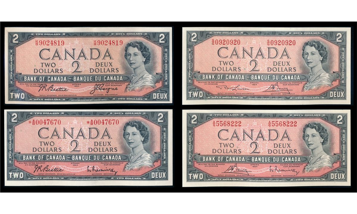 $2.00. 1954 Issue. BC-38a. No. K/B9024819. Beattie-Coyne. AU; $2.00. 1954 Issue. BC-38bA. No. *A/B0047670. Beattie-Rasminsky. Unc; $2.00. 1954 Issue. BC-38c. No. A/G5568222. Bouey-Rasminsky. Unc; $2.00. 1954 Issue. BC-38d. No. S/G0920920. Lawson-Bouey. Unc. Lot of four (4) notes.