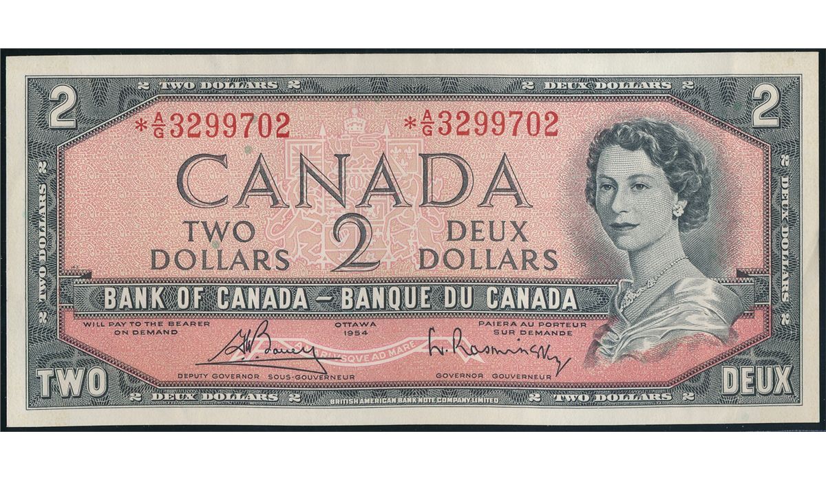 $2.00. 1954 Issue. BC-38cA. No. *A/G3299702. Bouey-Rasminsky. AU.
