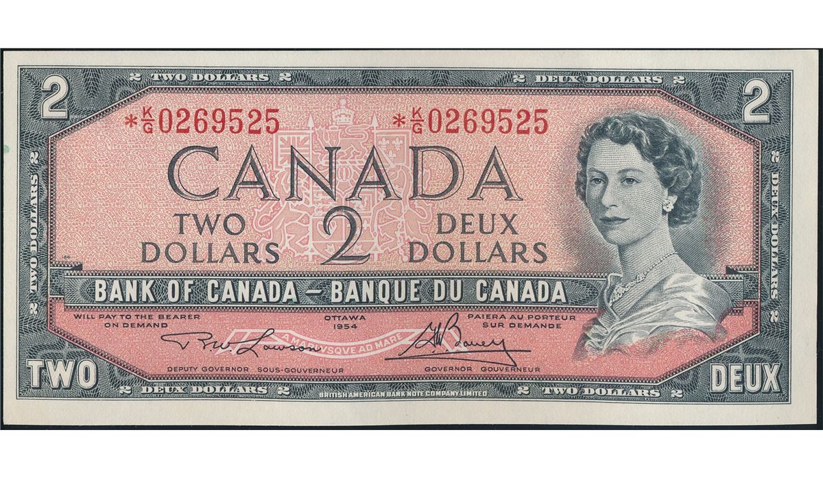 $2.00. 1954 Issue. BC-38dA. No. *K/G0269525. Lawson-Bouey. Unc.
