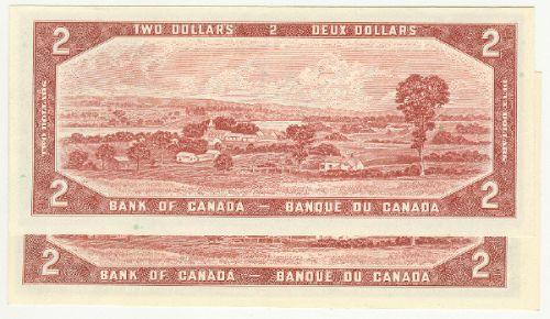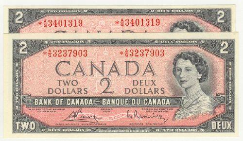 Bank of Canada; $2.00 1954 replacement, BC-38cA, UNC, signature; Bouey Rasminsky, serial; *A/G3237903, *A/G3401319. Lot of 2 replacement notes.