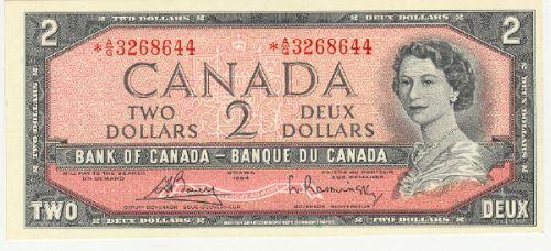 Bank of Canada; $2.00 1954 replacement, BC-38cA, UNC, signature; Bouey Rasminsky, serial; *A/G3268644.