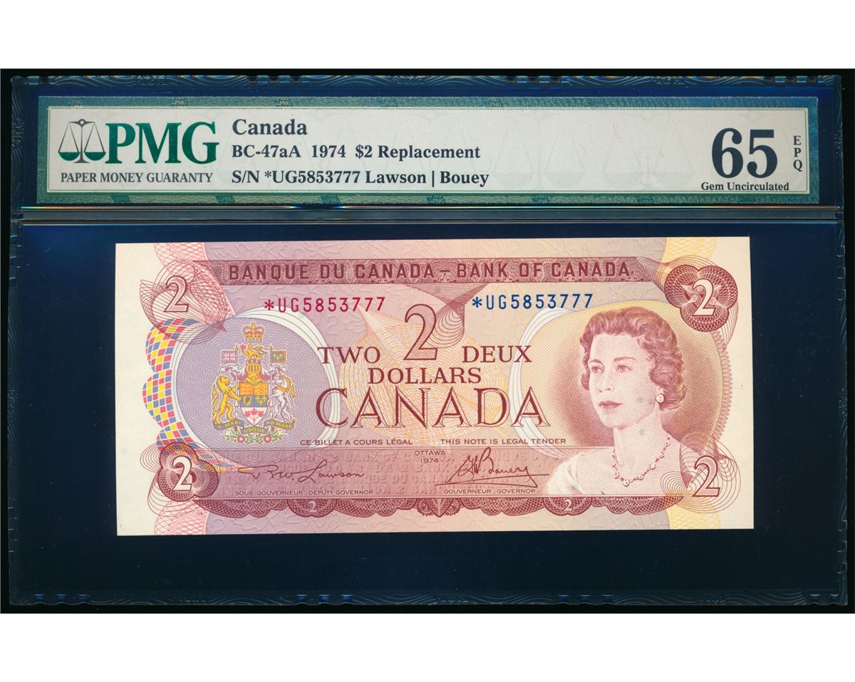 $2.00. 1974. BC-47aA. Lawson-Bouey. Replacement Note. No.*UG5853777. PMG graded Gem Uncirculated-65 EPQ.
