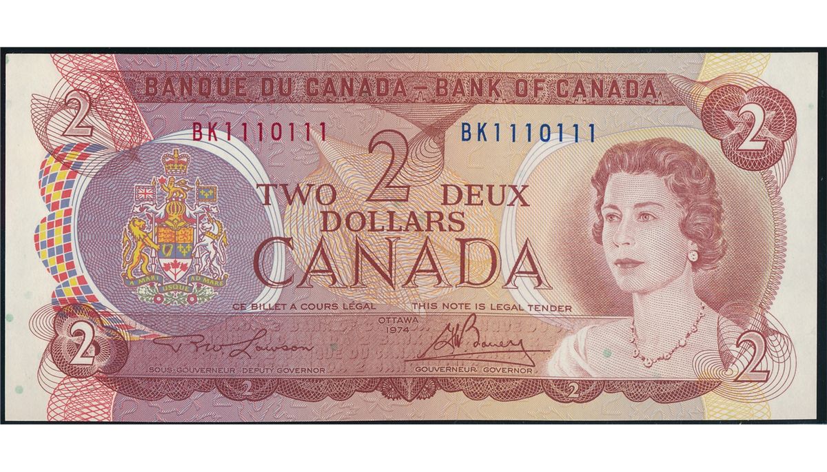 $2.00. 1974 Issue. BC-47a. No. BK1110111. Lawson-Bouey. Unc. A 'Radar' note.