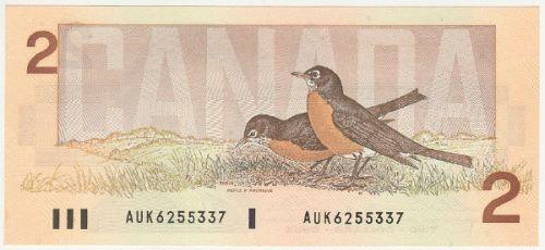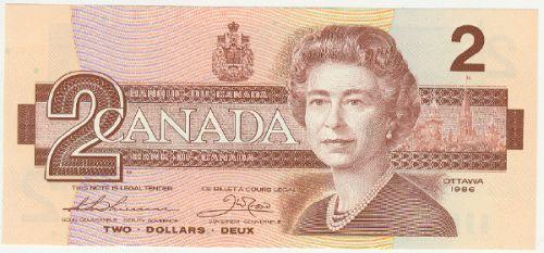 Bank of Canada; $2.00 1986, BC-55b, UNC, Signature; Thiessen Crow, Serial; AUK6255337.
