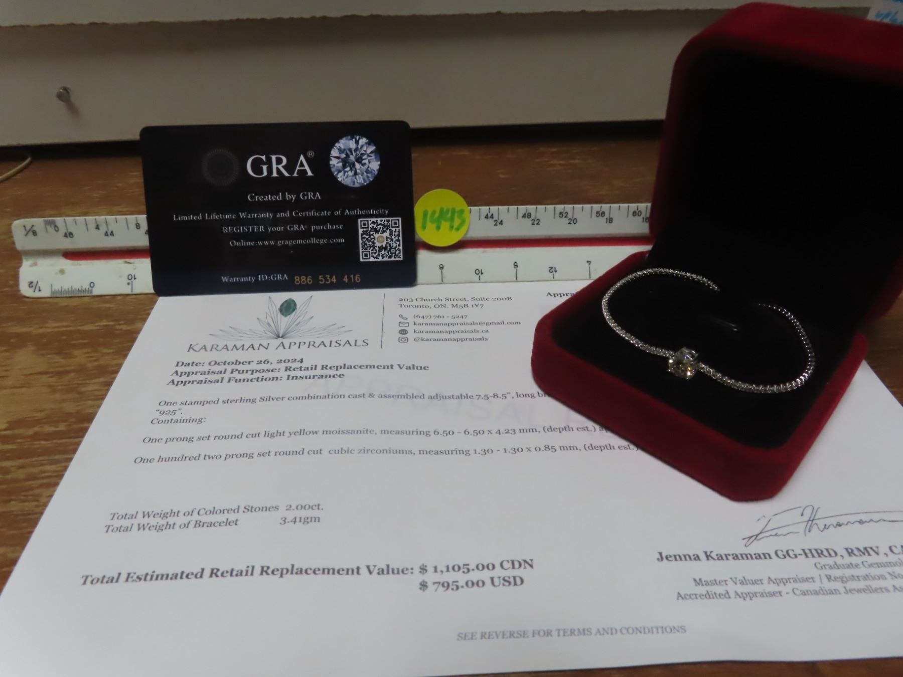 ROUND BRILLIANT CUT MOISSANITE STONES VVS VERY LIGHT YELLOW COLOR SET IN CENTER OF 4 CLAW BASKET SET ON BRACELET WITH 102 ROUND BRILLIANT CUT CUBIC ZIRCONIA SET IN 925 RETAIL VALUE $1,475.00