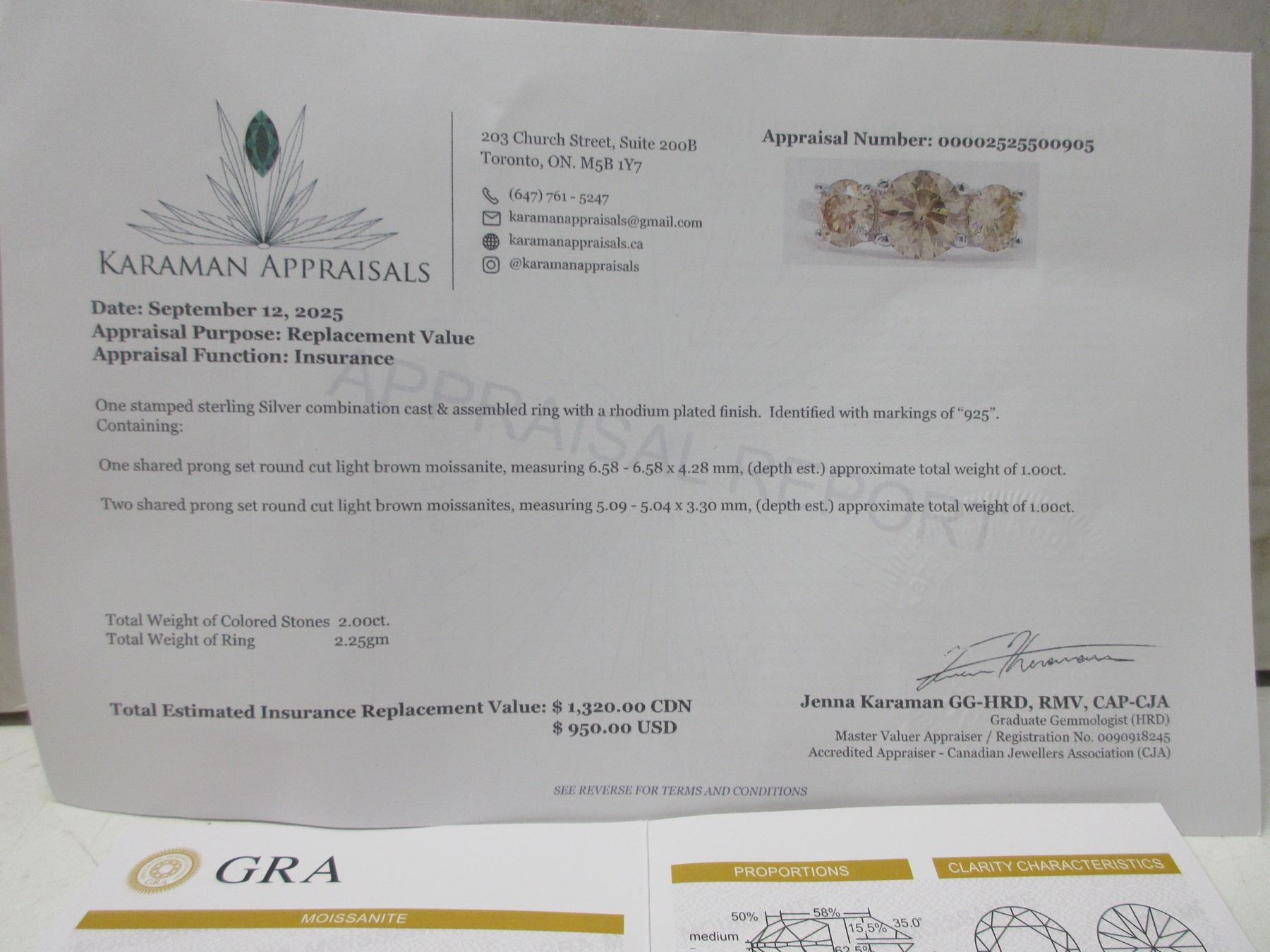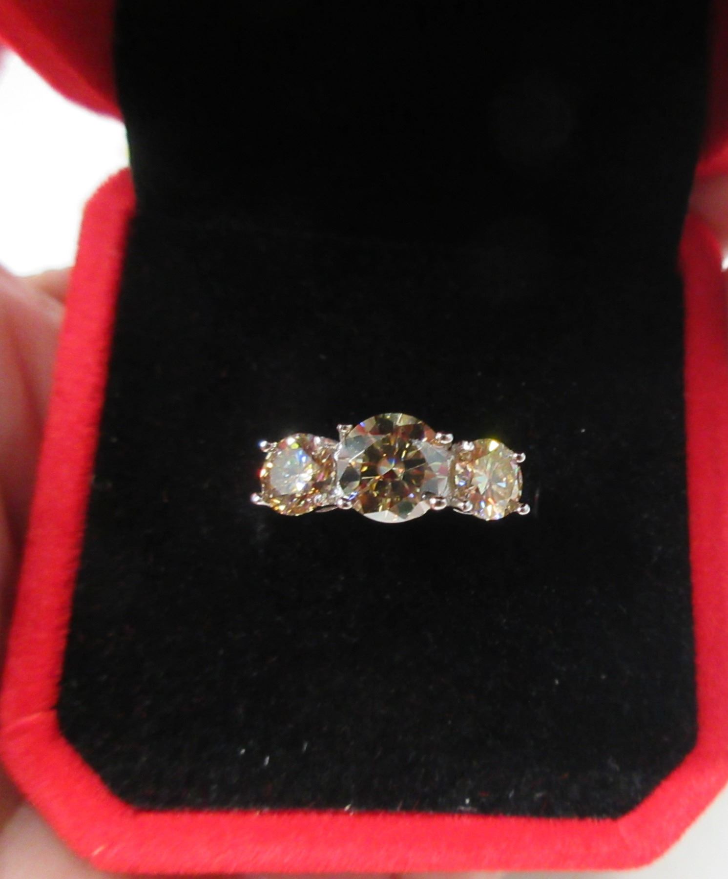 2.00 CT TW GRA CERTIFIED ROUND BRILLIANT CUT MOISSANITE STONES VVS CHAMPAGNE COLOR WITH 1.00 CT SET IN CENTER WITH 0.50 SET ON EITHER SIDE SET IN 925 SILVER RING SIZE 6 RETAIL VALUE $1,320.00
