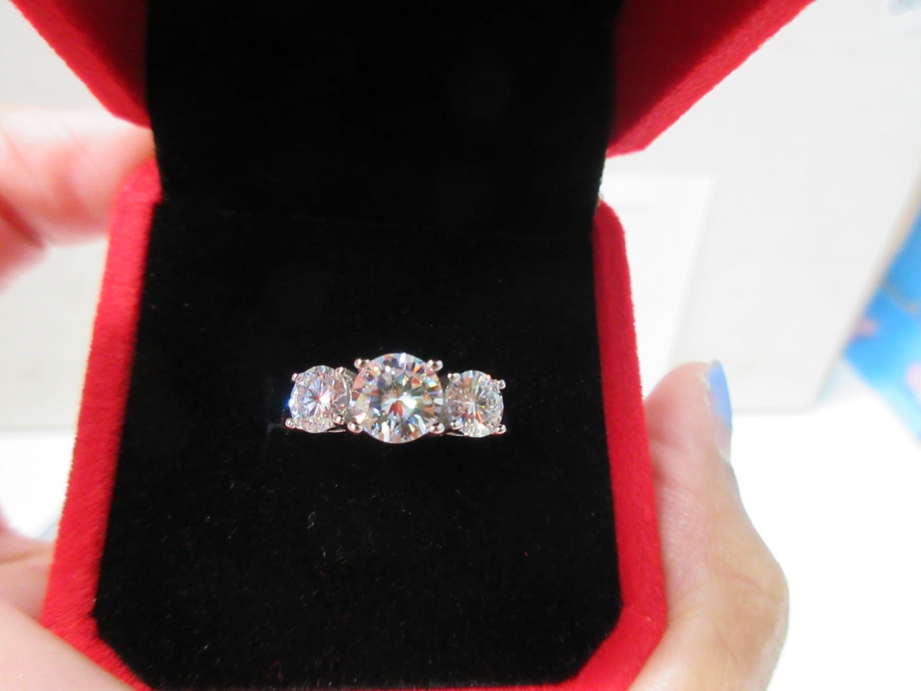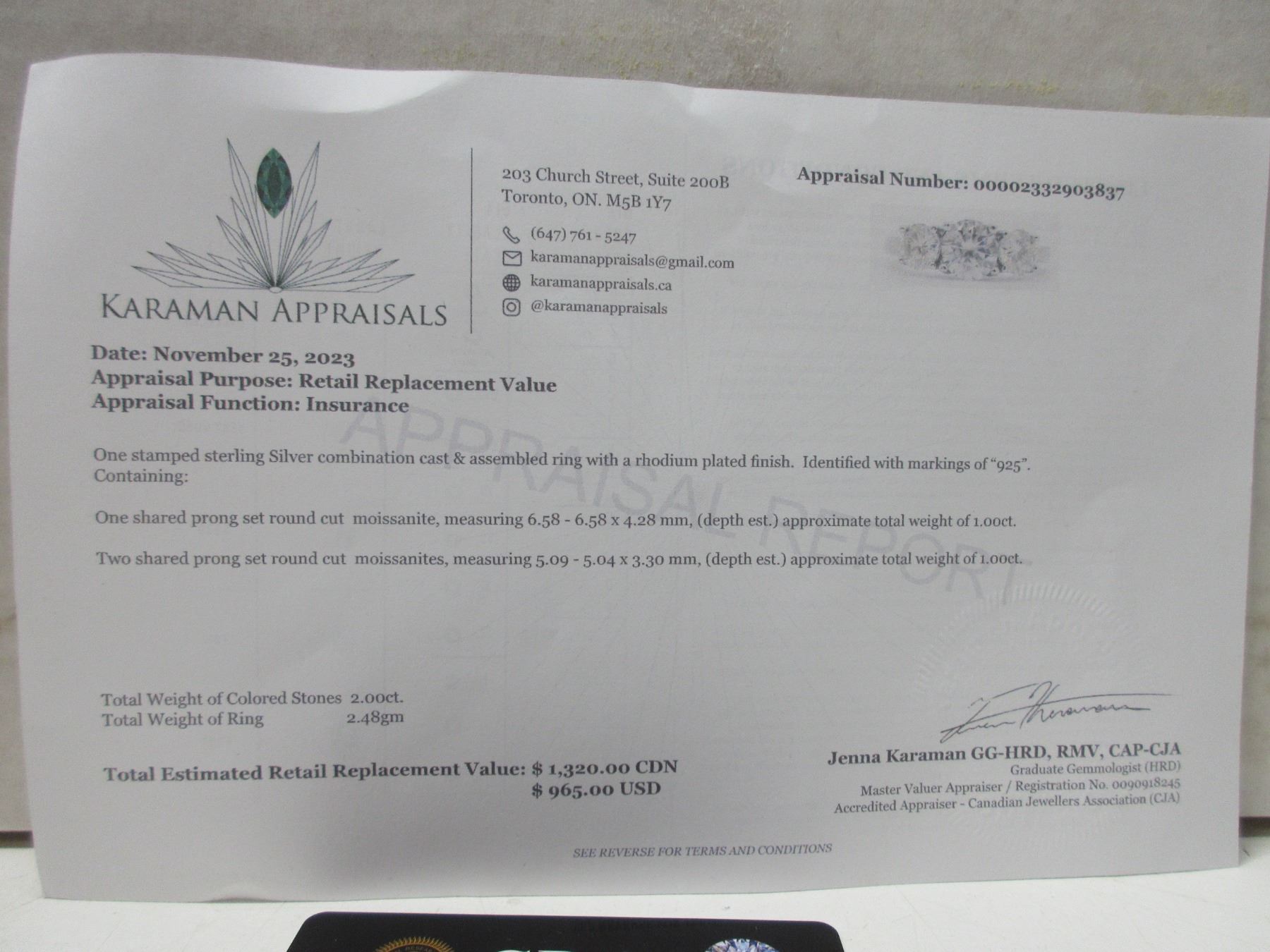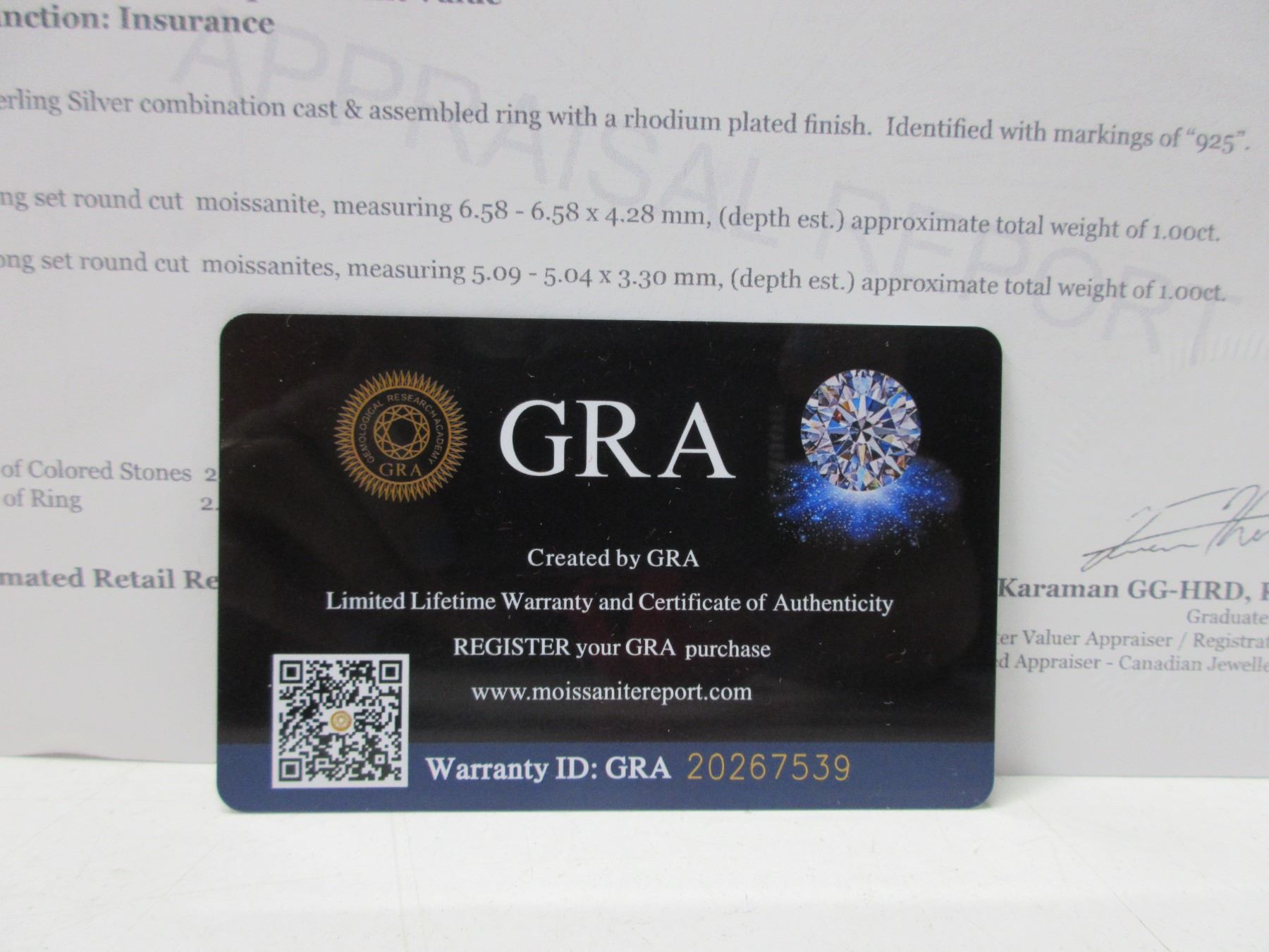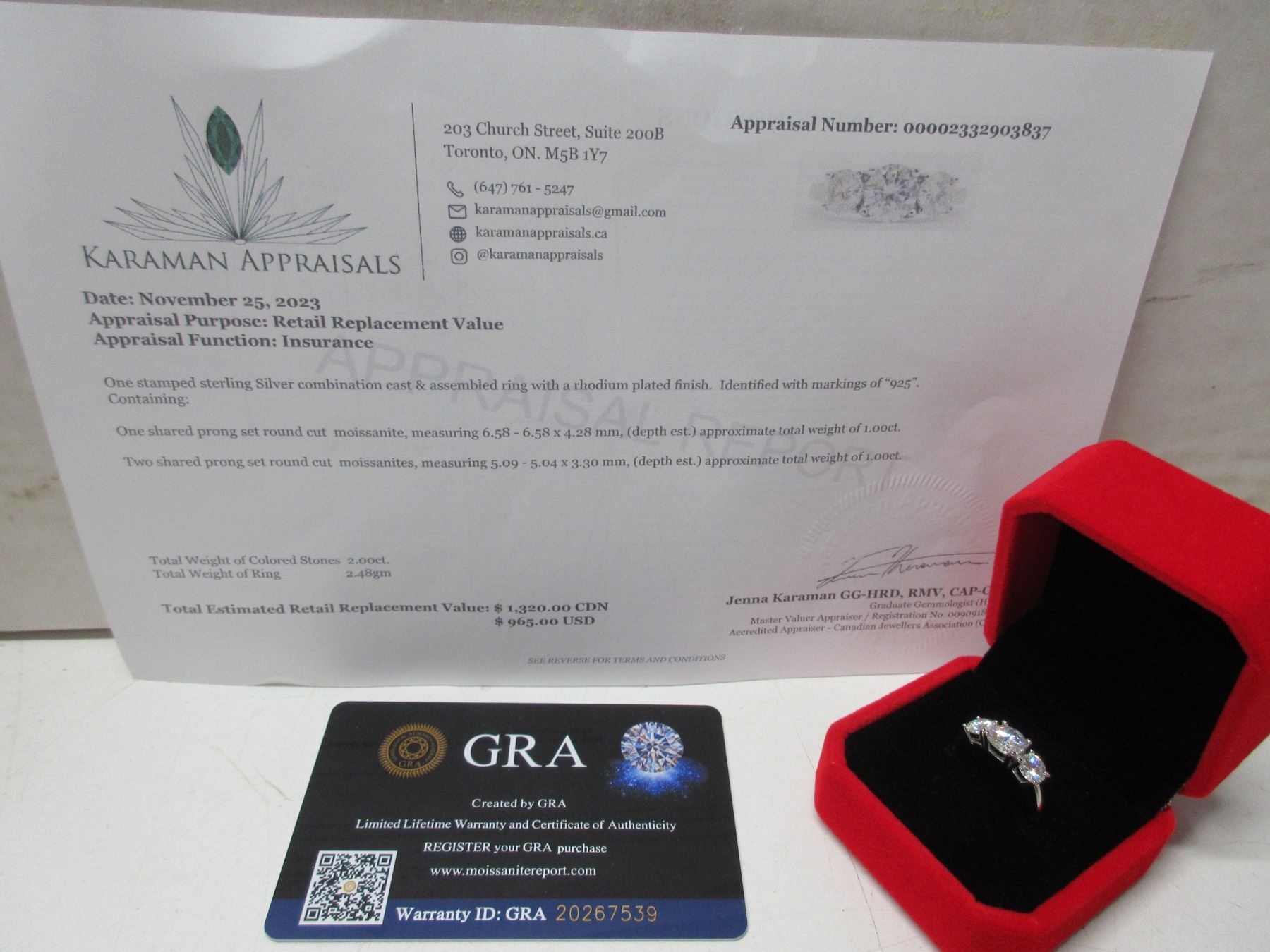 2.00 CT TW GRA CERTIFIED ROUND BRILLIANT CUT MOISSANITE STONES VVS D COLOR WITH 1.00 CT SET IN CENTER WITH 0.50 SET ON EITHER SIDE SET IN 925 SILVER RING SIZE 6 RETAIL VALUE $1,320.00