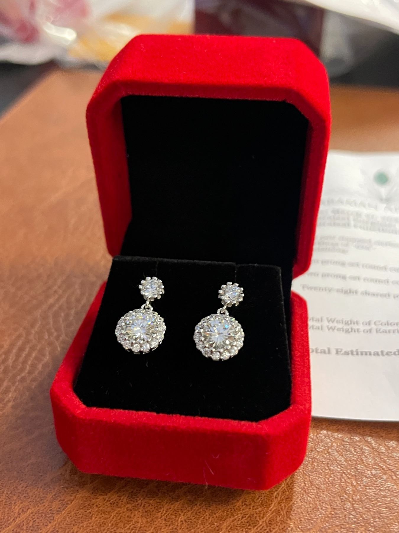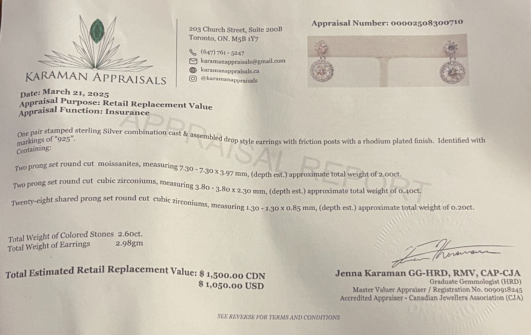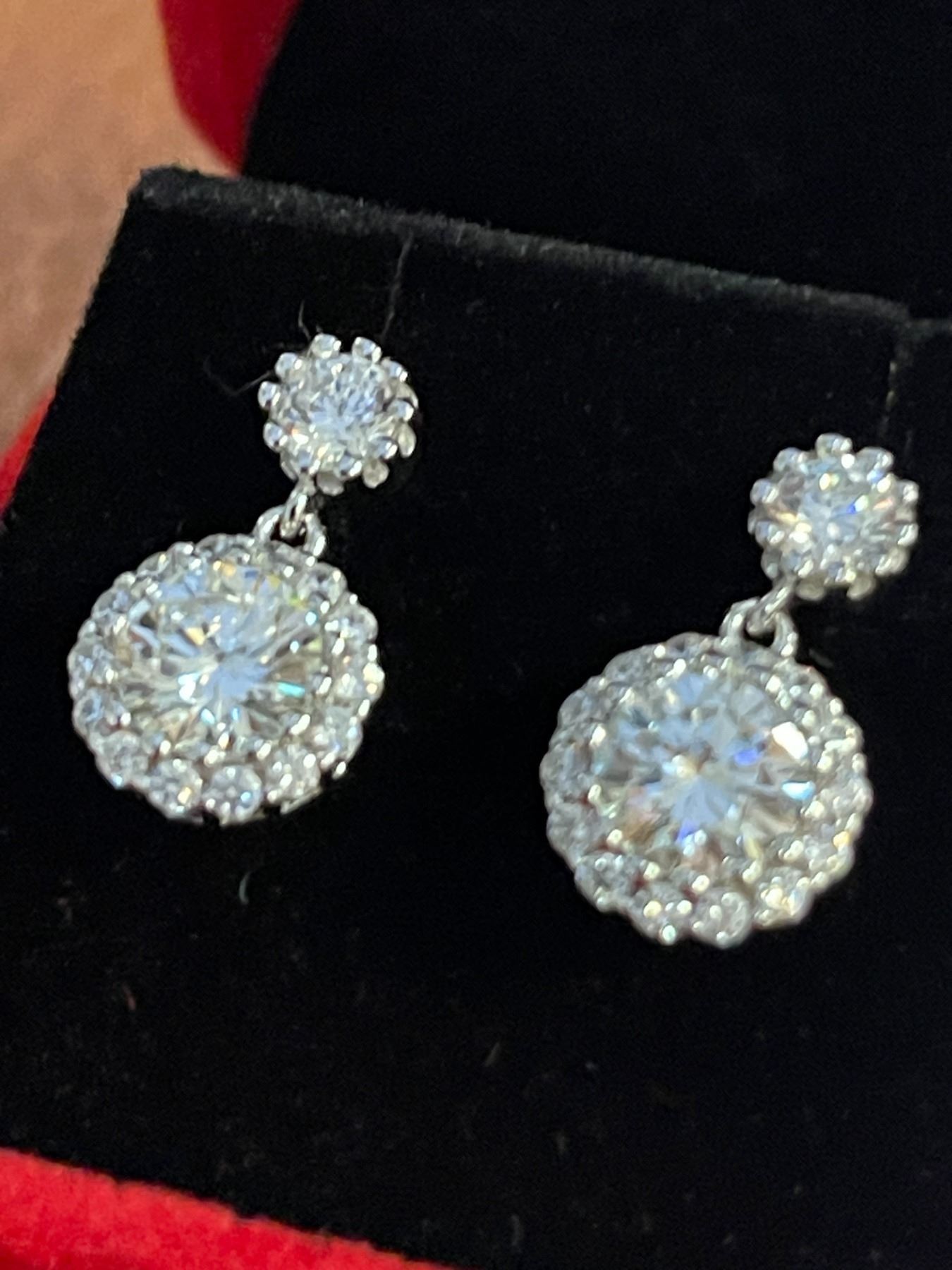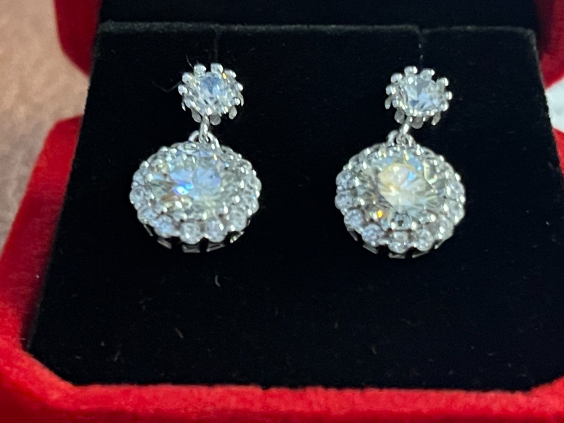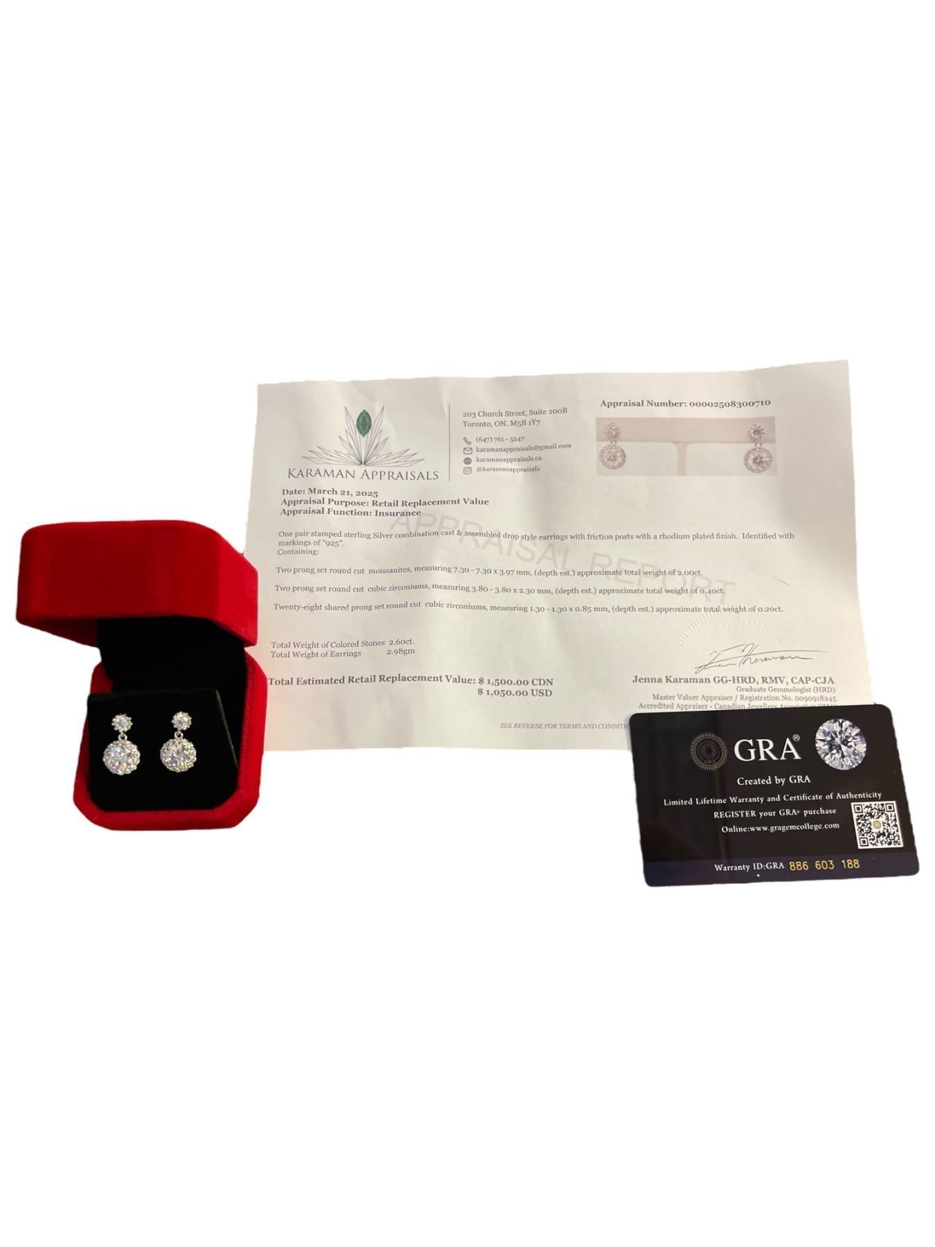 2.00 CT TW GRA CERTIFIED ROUND BRILLIANT CUT MOISSANITE STONES VVS D COLOR WITH 28 ROUND BRILLIANT CUT CUBIC ZIRCONIA SET IN ROUND HALOS WITH 1 POST THAT DANGLES THE HALO OFF OF SET IN 925 SILVER EARRINGS RETAIL VALUE $1,500.00