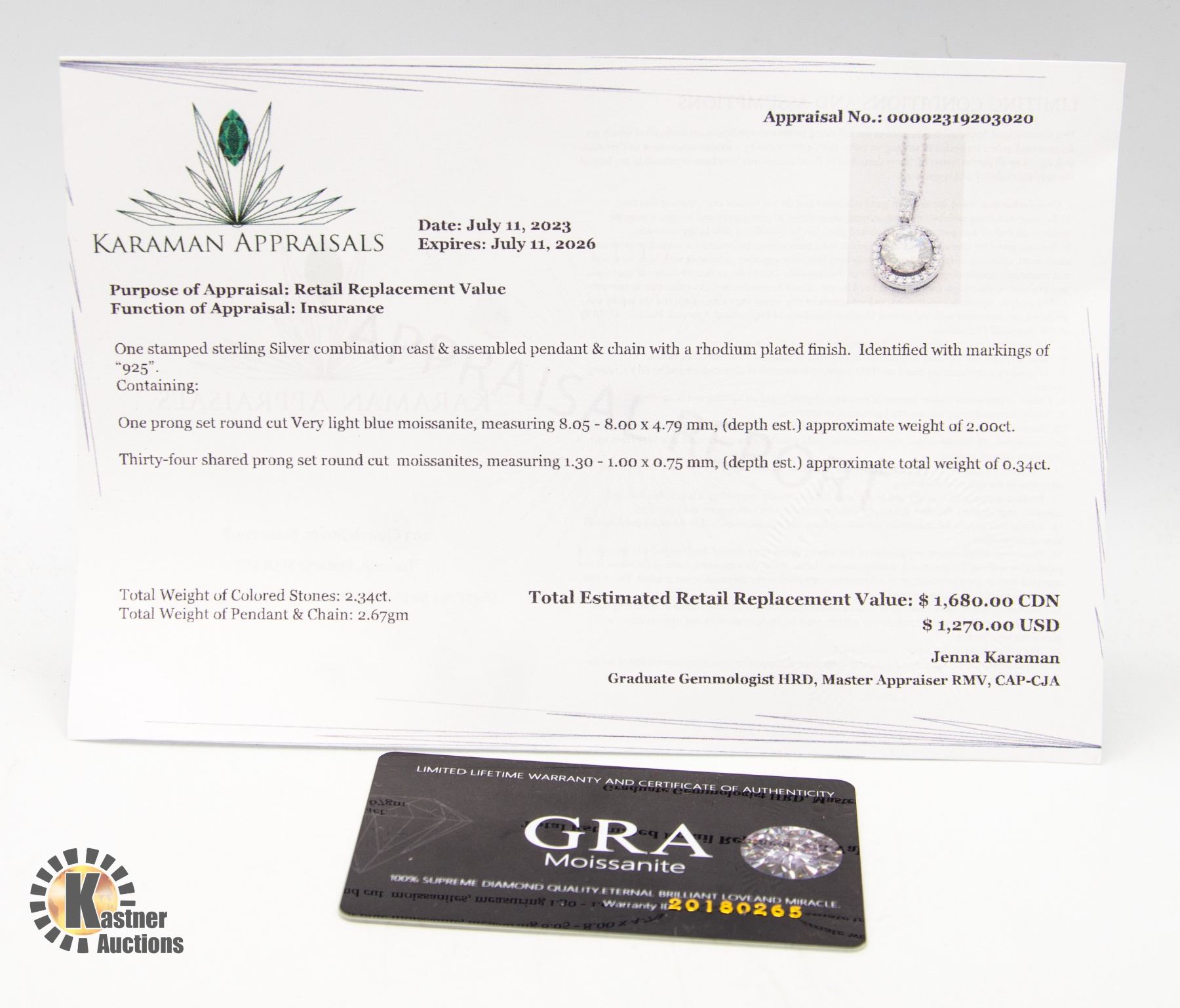 BY 34 CUBIC ZIRCONIA IN HALO AND IN BAIL IN PENDANT WEIGHING 0.34 CT TOTAL GRA CERTIFIED STAMPED 925 APPRAISED VALUE $1,680.00 **ALL ITEMS MUST BE REMOVED BY 5PM SATURDAY, AUGUST 26TH 2023. ALL REMAINING ITEMS WILL BE SUBJECT TO A $6.00 PER DAY STORAGE CHARGE. ANY ITEMS REMAINING AFTER MONDAY, SEPTEMBER 11TH, 2023 WILL BE CONSIDERED FORFEITED. NO REFUNDS WILL BE ISSUED FOR FORFEITED ITEMS. TO SCHEDULE A PICK UP APPOINTMENT CLICK HERE