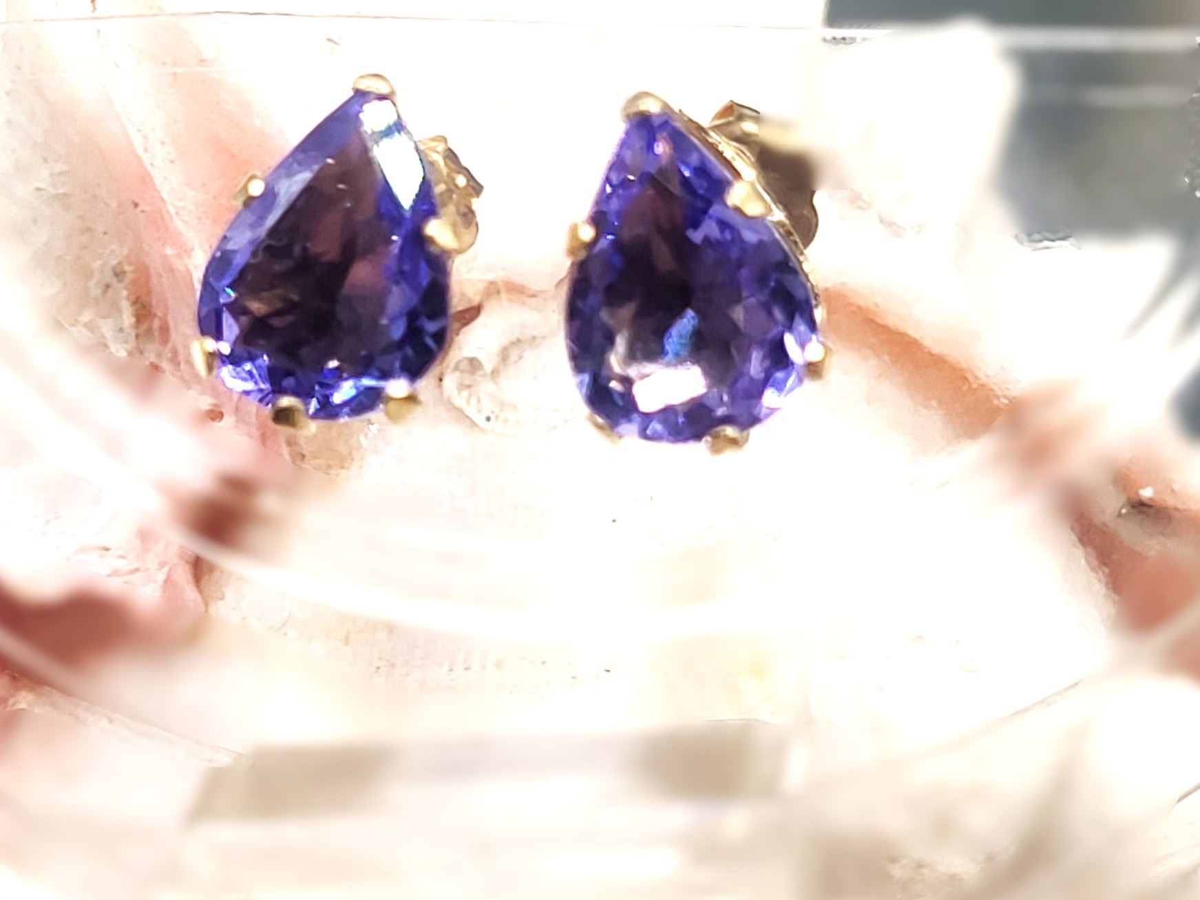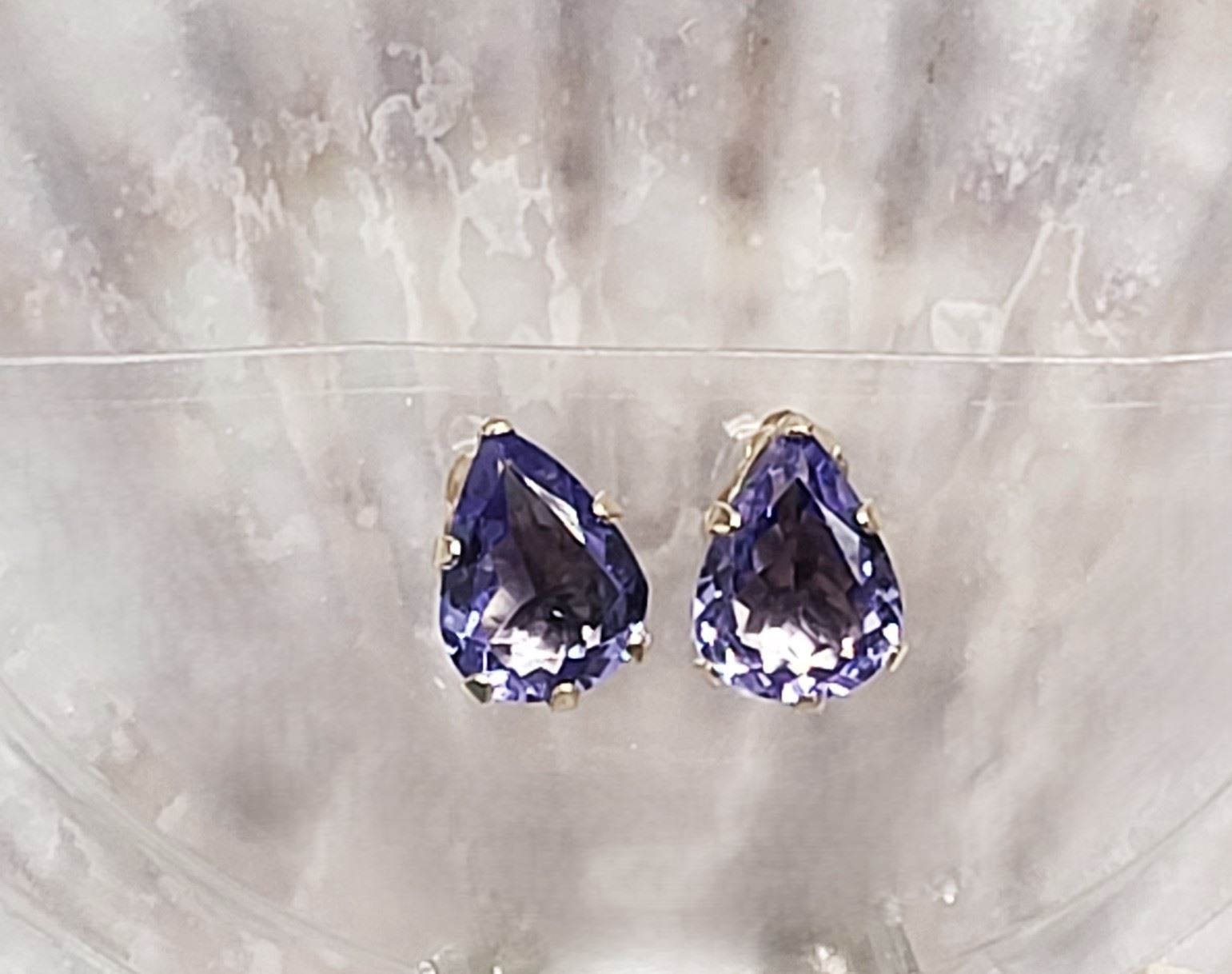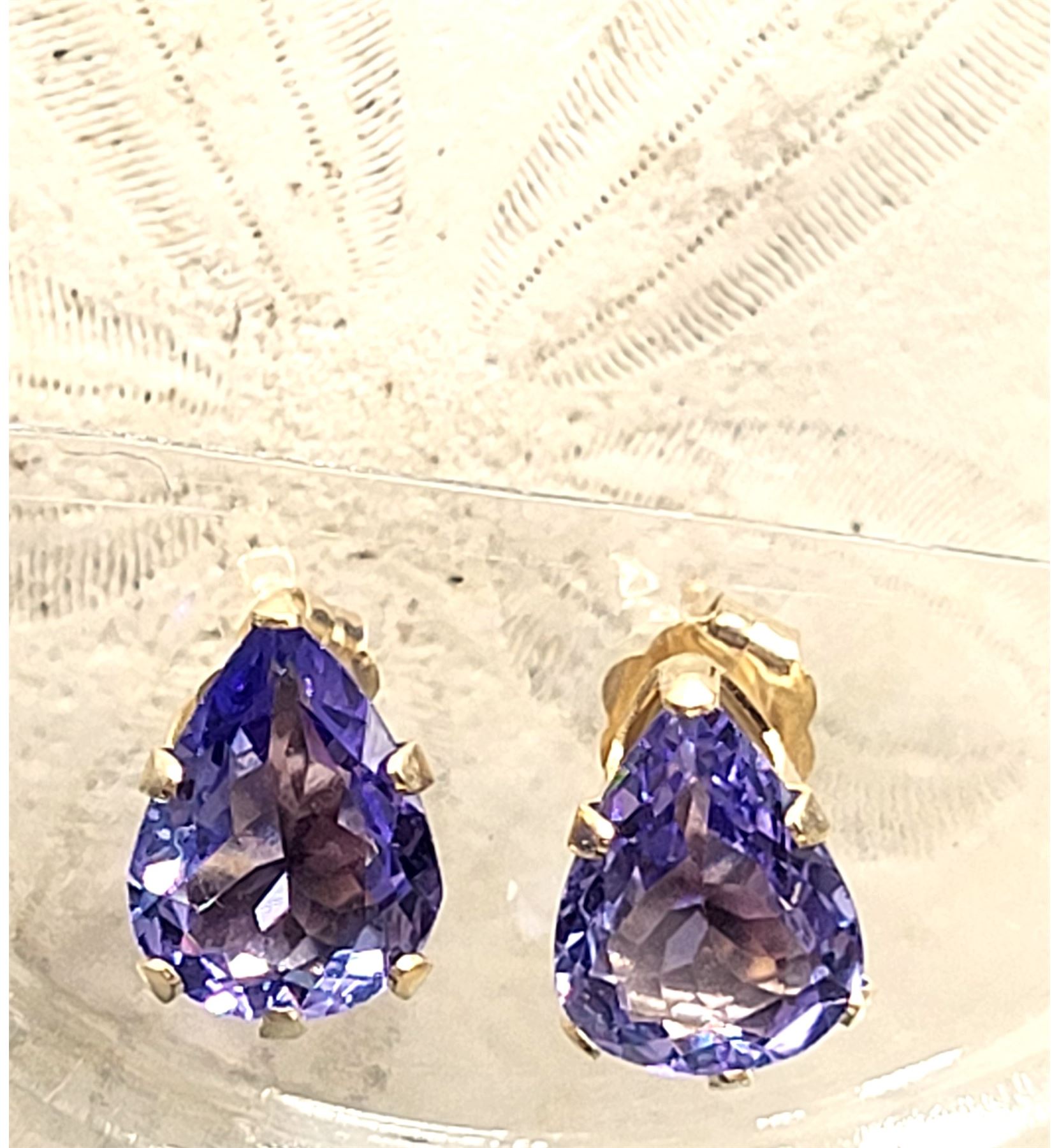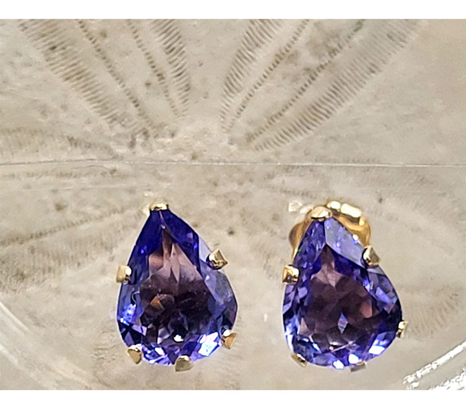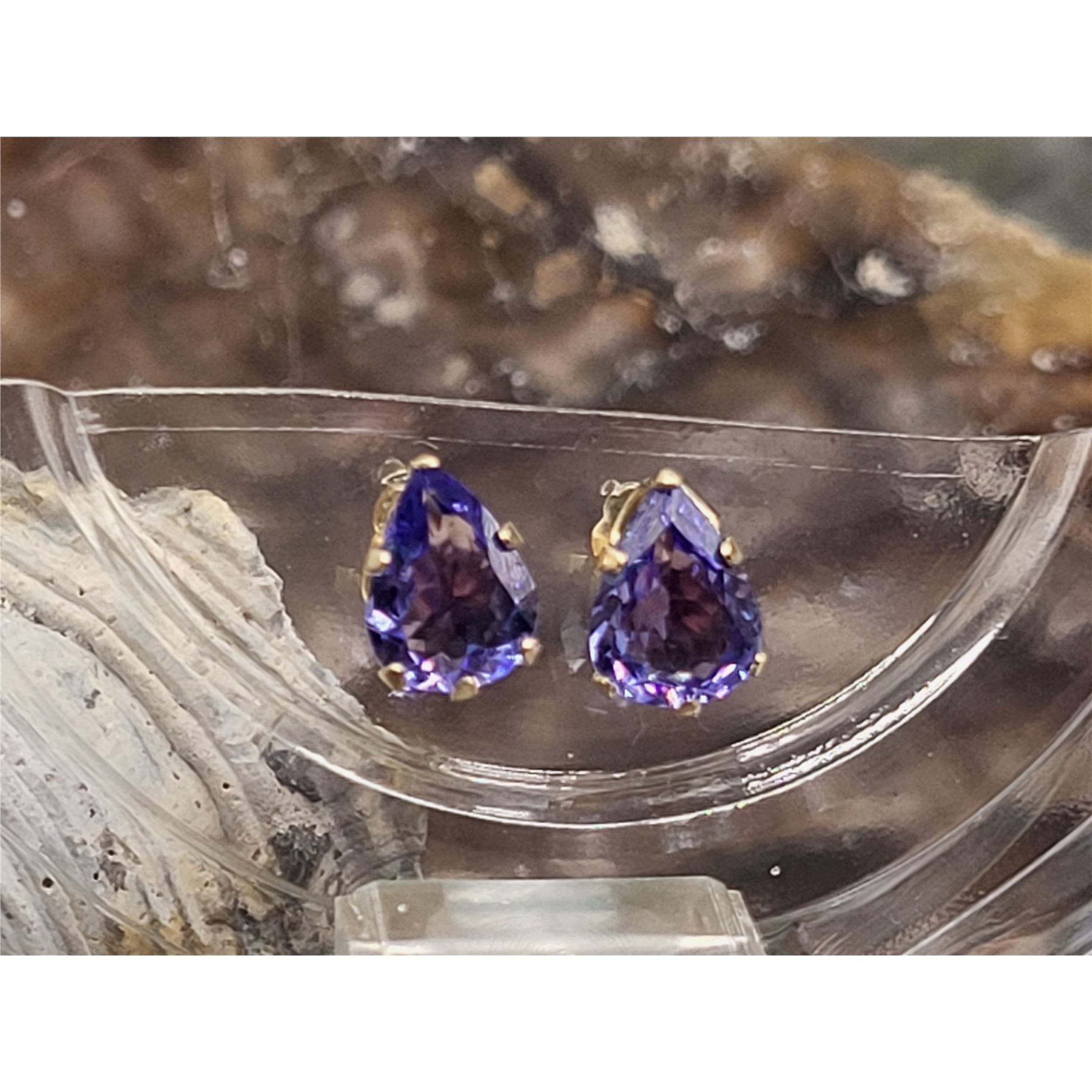 This is a pair of 14 karat yellow gold tanzanite solitaire earrings. Each tanzanite is one-carat, pear-cut, earth-mined, and prong-set.& nbsp; The earrings attach to the earlobe with posts and friction backs.& nbsp; & nbsp;Admin: G11251/28let