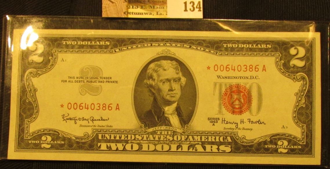 $2.00. Friedberg 1514 Star Replacement Note 1963A. No.*000640386A. Choice Crisp Uncirculated with excellent color. Exceptionally well centered Rare Star note in great condition.