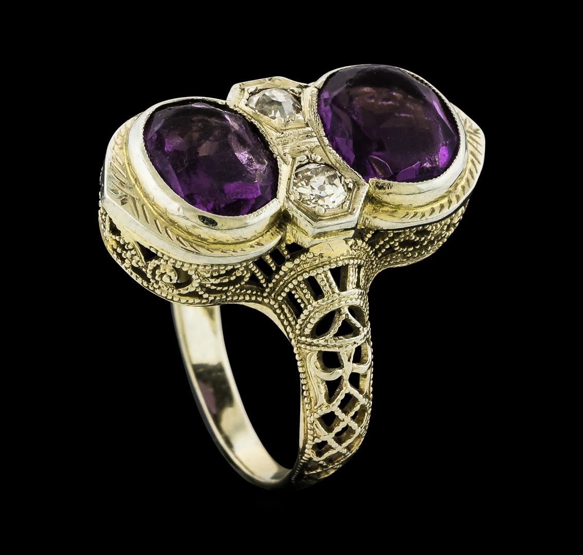 One electronically tested 18KT white gold lady's cast vintage style fashion ring with a bright polish with milgrain detailing finish. The featured lady's vintage ring has hand engraved and filigree detailing and a shank measuring 1.92 millimeters wide. Condition is used, good workmanship. Containing: Two bezel set oval modified mixed cut natural amethysts, measuring 8.10 x 6.20 x 3.35mm, (depth est.) 7%. bulge factor, approximate total weight of 2.00ct., clarity is slightly included, medium light, moderately strong, purple color, (GIA P 4/4), cut is good. Transmitting light with a minimum of distortion, transparent. Colored gemstones are presumed to have been subjected to commonly used enhancement processes. The featured gemstones have surface abrasions due to wear. Graded in the setting. Two prong set old mine cut diamonds, measuring 2.60 - 2.50 x 1.58mm (depth est.) approximate total weight of 2 Stones = 0.13ct. Graded in the setting. Clarity VS-2 to SI-1. Color: G - H Cut Good. Total Weight of Colored Stones 2.00ct.. Total Weight of Diamonds 0.13ct.. Total Weight of Ring 3.70gm. GAS Appraised at $1,100.00.