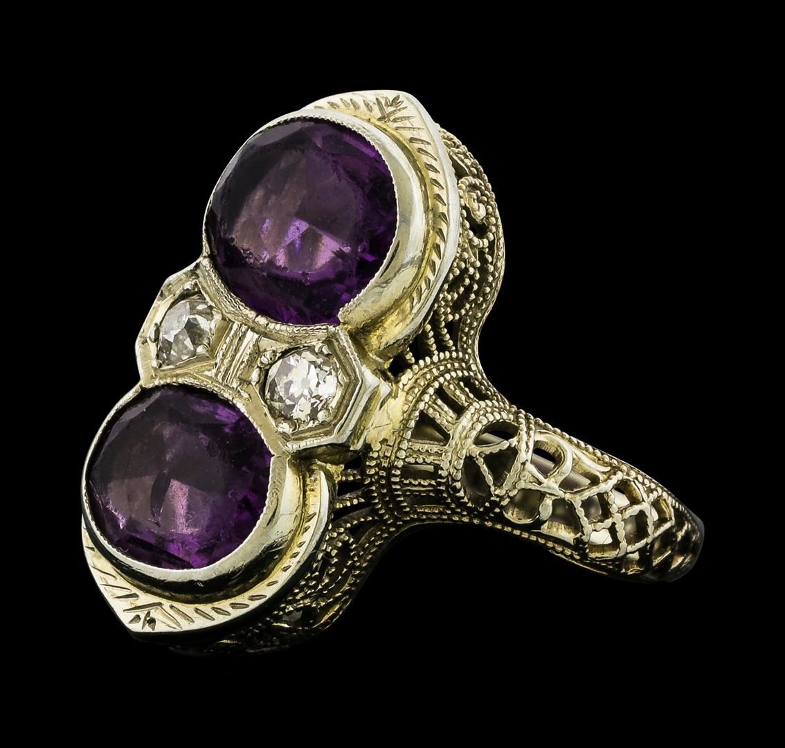 One electronically tested 18KT white gold lady's cast vintage style fashion ring with a bright polish with milgrain detailing finish. The featured lady's vintage ring has hand engraved and filigree detailing and a shank measuring 1.92 millimeters wide. Condition is used, good workmanship. Containing: Two bezel set oval modified mixed cut natural amethysts, measuring 8.10 x 6.20 x 3.35mm, (depth est.) 7%. bulge factor, approximate total weight of 2.00ct., clarity is slightly included, medium light, moderately strong, purple color, (GIA P 4/4), cut is good. Transmitting light with a minimum of distortion, transparent. Colored gemstones are presumed to have been subjected to commonly used enhancement processes. The featured gemstones have surface abrasions due to wear. Graded in the setting. Two prong set old mine cut diamonds, measuring 2.60 - 2.50 x 1.58mm (depth est.) approximate total weight of 2 Stones = 0.13ct. Graded in the setting. Clarity VS-2 to SI-1. Color: G - H Cut Good. Total Weight of Colored Stones 2.00ct.. Total Weight of Diamonds 0.13ct.. Total Weight of Ring 3.70gm. GAS Appraised at $1,100.00.