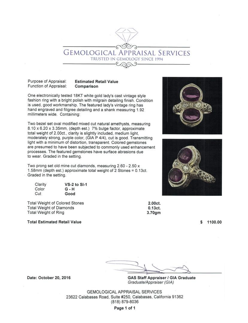 One electronically tested 18KT white gold lady's cast vintage style fashion ring with a bright polish with milgrain detailing finish. The featured lady's vintage ring has hand engraved and filigree detailing and a shank measuring 1.92 millimeters wide. Condition is used, good workmanship. Containing: Two bezel set oval modified mixed cut natural amethysts, measuring 8.10 x 6.20 x 3.35mm, (depth est.) 7%. bulge factor, approximate total weight of 2.00ct., clarity is slightly included, medium light, moderately strong, purple color, (GIA P 4/4), cut is good. Transmitting light with a minimum of distortion, transparent. Colored gemstones are presumed to have been subjected to commonly used enhancement processes. The featured gemstones have surface abrasions due to wear. Graded in the setting. Two prong set old mine cut diamonds, measuring 2.60 - 2.50 x 1.58mm (depth est.) approximate total weight of 2 Stones = 0.13ct. Graded in the setting. Clarity VS-2 to SI-1. Color: G - H Cut Good. Total Weight of Colored Stones 2.00ct.. Total Weight of Diamonds 0.13ct.. Total Weight of Ring 3.70gm. GAS Appraised at $1,100.00.