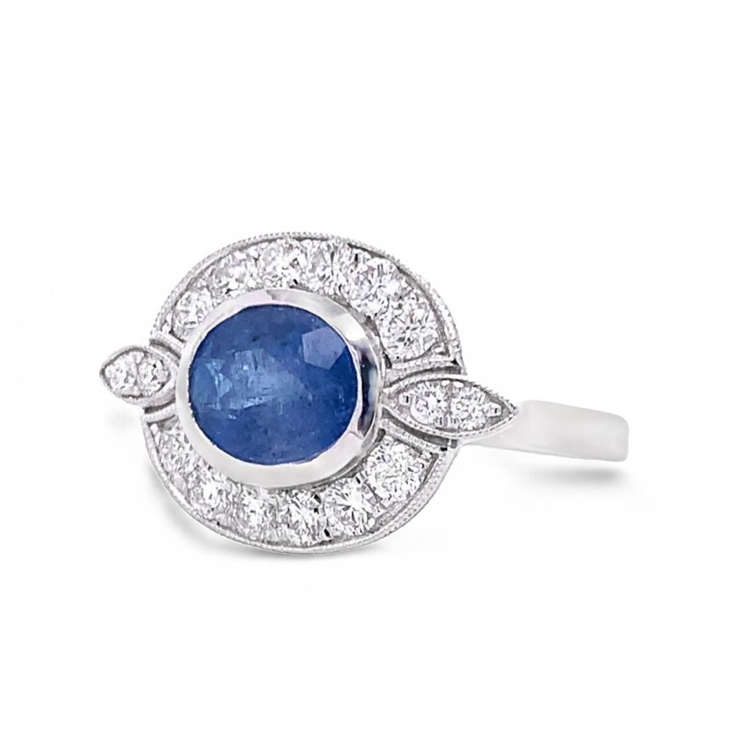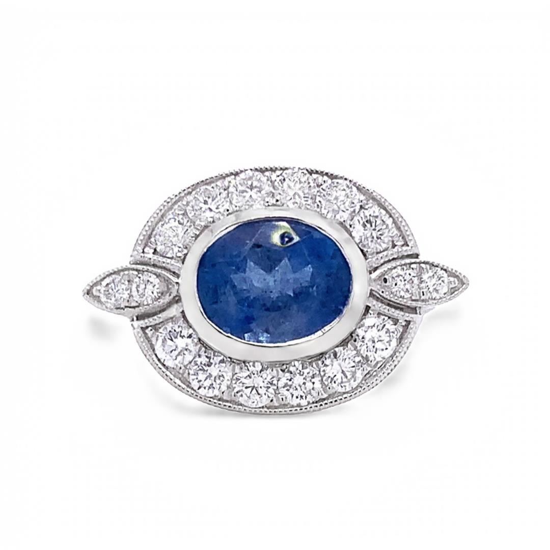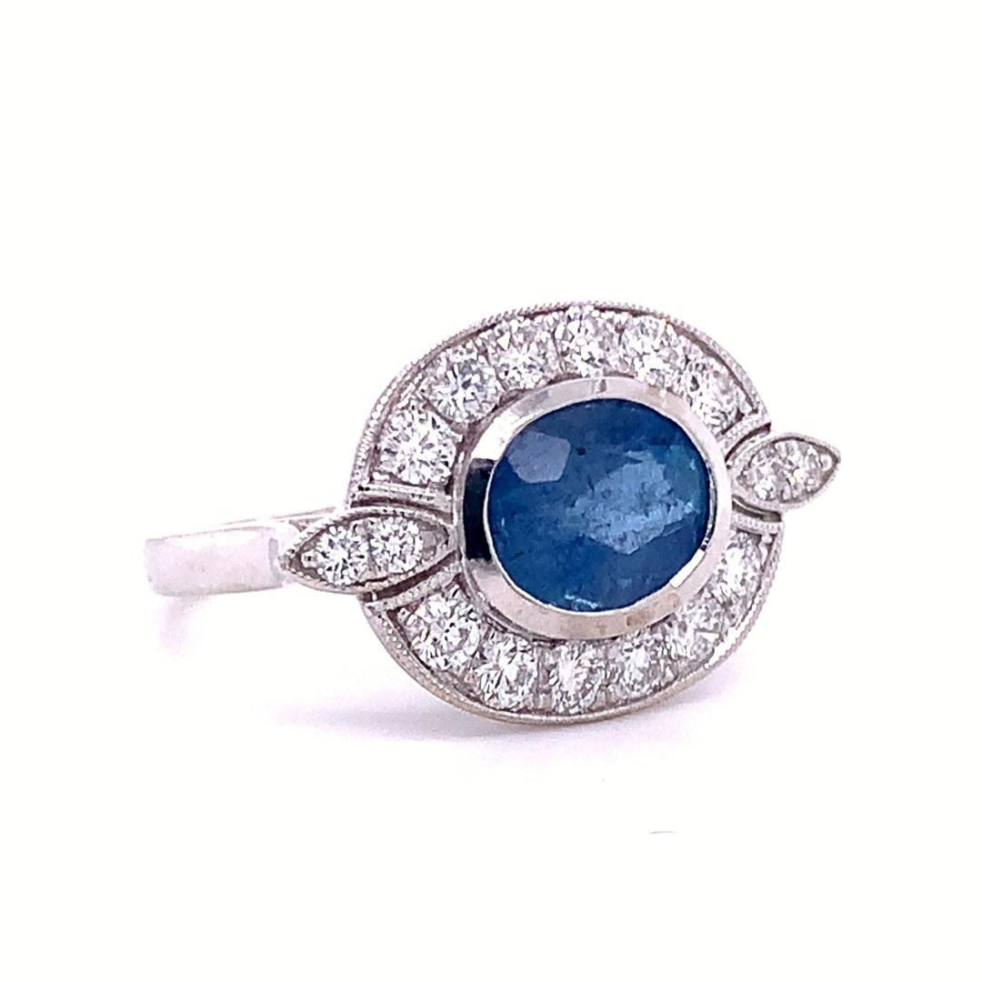 One polished, stamped, and tested 18K white gold ring with a bright finish. The ring is mounted with: 1 genuine aquamarine center stone weighing approximately 2.00 carat, and 16 genuine round diamonds weighing approximately 0.83 carats. This item weighs 5.5 grams, condition is new, excellent workmanship. #MAIN GEMSTONE# Species: Natural Beryl Variety: Aquamarine Shape: Oval Cutting Style: Modified Brilliant Cut Measurements: 8.5 x 6.8 x 5.4mm Weight: 2.00 carat Color: Light Blue Cut Grade: Very Good Refractive Index: 1.577 to 1.583 DR Birefringence: 0.005 - 0.009 Hardness: 7.5 - 8 #ADJACENT GEMSTONES ON RING# Identity: Natural Diamond Shape: Round Cutting Style: Brilliant Cut Quantity: 16 Diamonds Measurements: 2.0 - 2.7mm Total Weight: 0.83 carats Color Grade: G - H Clarity Grade: VS2 - SI1 Refractive Index: 2.418 Hardness: 10 AQUAMARINE WEIGHT: 2.00 ctw TOTAL DIAMOND WEIGHT: 0.83 ctw WEIGHT OF ITEM: 5.5 grams GOLD CONTENT: 18K White Gold