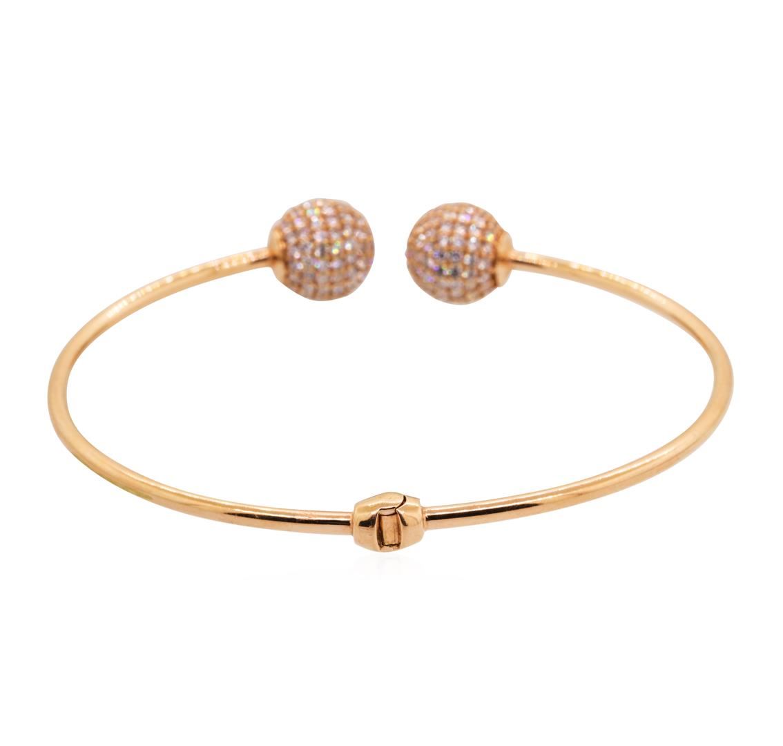 One cuff bangle bracelet with six inch circumference featuring: 14KT rose gold weighing 7.5 grams containing cubic zirconia weighing 2.00ctw.