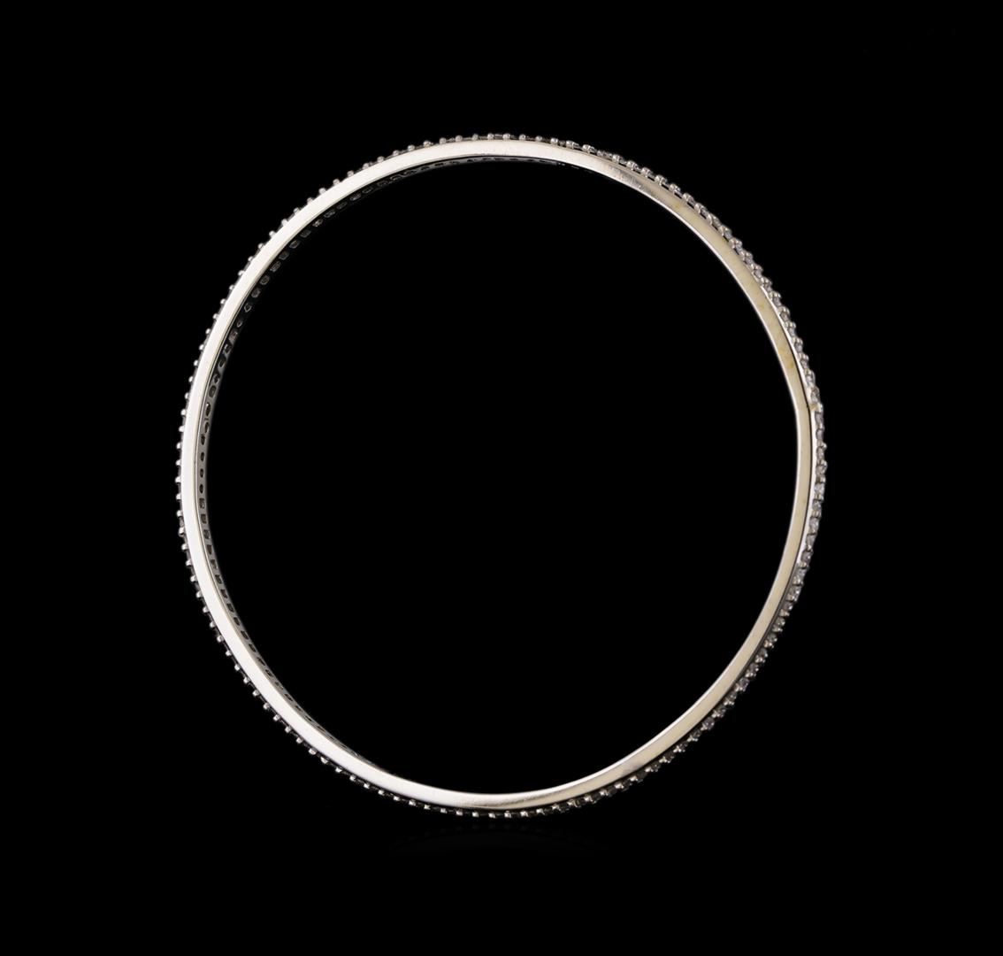 One electronically tested 18KT white gold ladies cast diamond bangle. Seven and three quarter inch wearable length bangle features a rigid diamond ribbon measuring two millimeters wide. Bright polish finish. Condition is good. Containing: One Hundred Twenty-Four prong set round brilliant cut diamonds, measuring 1.60 - 1.60 x 0.96mm (depth est.) approximate total weight of 124 Stones = 2.00ct. Graded in the setting. Clarity: I-2 to I-3. Color: G - I. Total Weight of Diamonds 2.00ct. Total Weight of Bangle 12.94gm. AIG Appraised at $6,535.00.