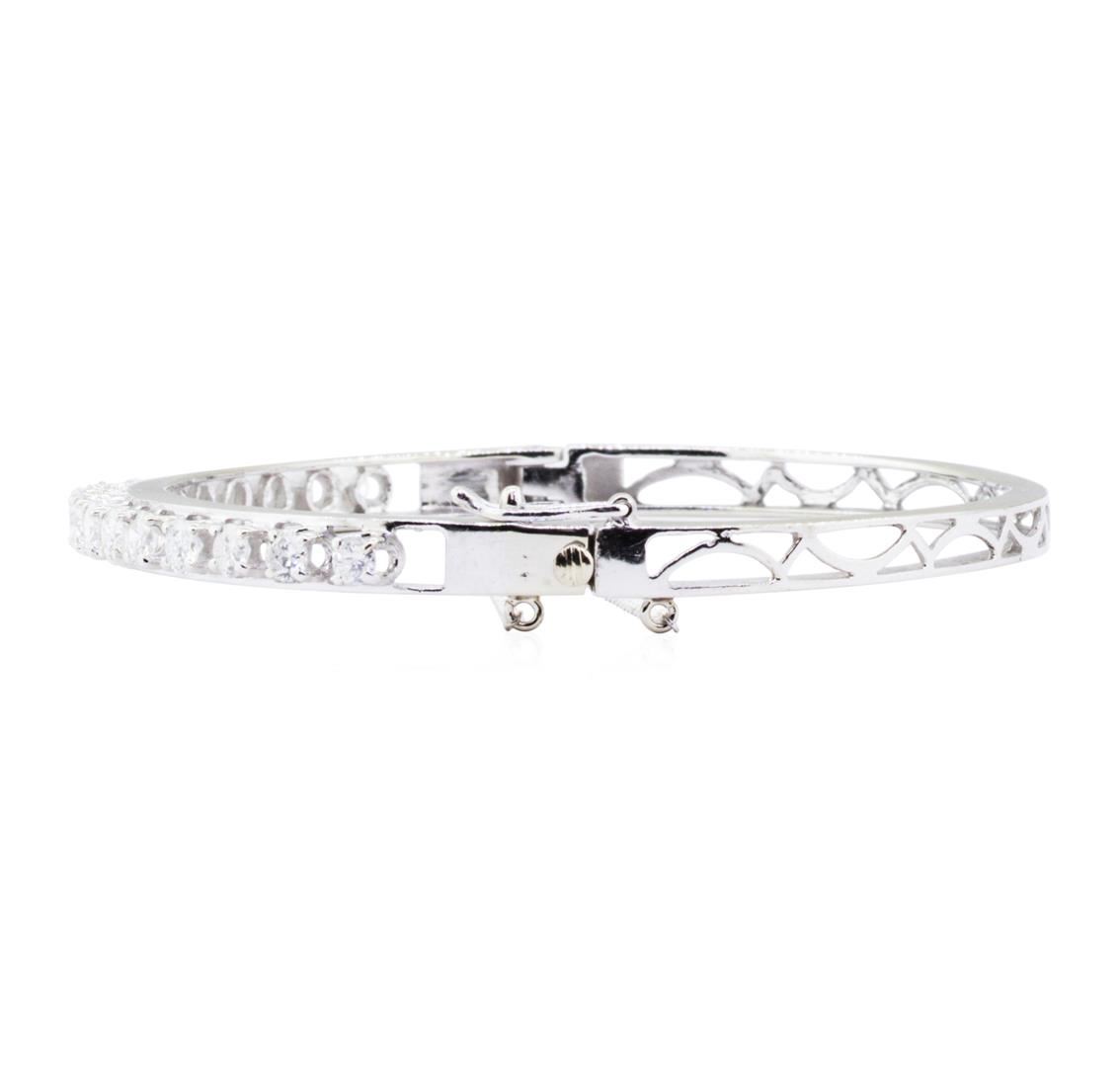 One electronically tested 14KT white gold lady's combination cast & assembled fashion bangle bracelet with a tongue clasp with foldover safety with a safety chain with a bright polish finish. Condition is like new, good workmanship. The featured lady's bangle bracelet measures 4.2mm in width and has a circumference of 6.5 inches. Identified with markings of "14K". Containing: Seventeen prong set round brilliant cut diamonds, measuring 3.55 - 2.70 x 1.94mm (depth est.) approximate total weight of 17 Stones = 2.00ct. Graded in the setting. Color Clarity Cut H-1 SI-1 to 1-1 Good Total Weight of Diamonds Total Weight of Bracelet 2.00ct. 10.70gm Total Estimated Retail Value $ 6500.00