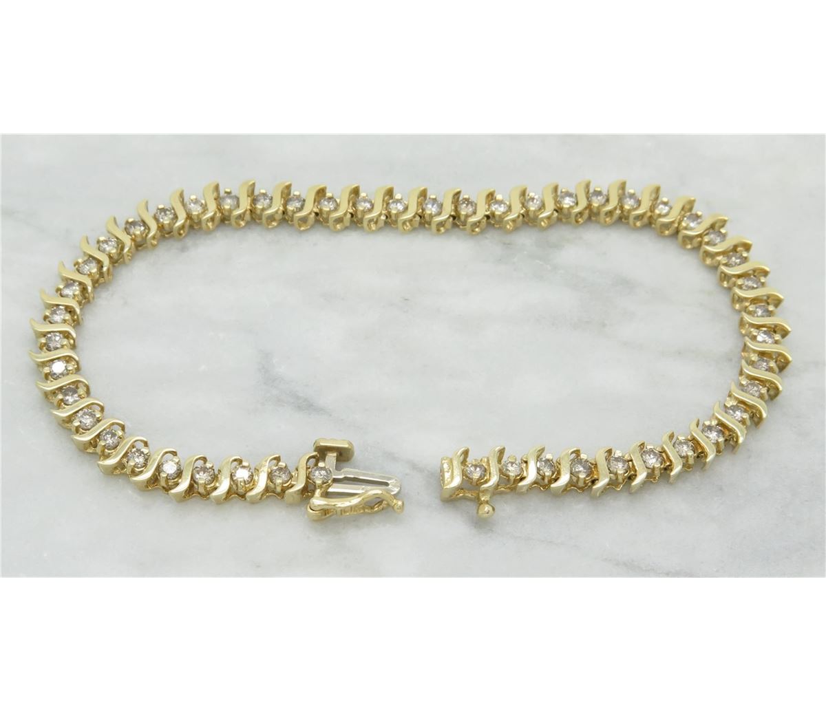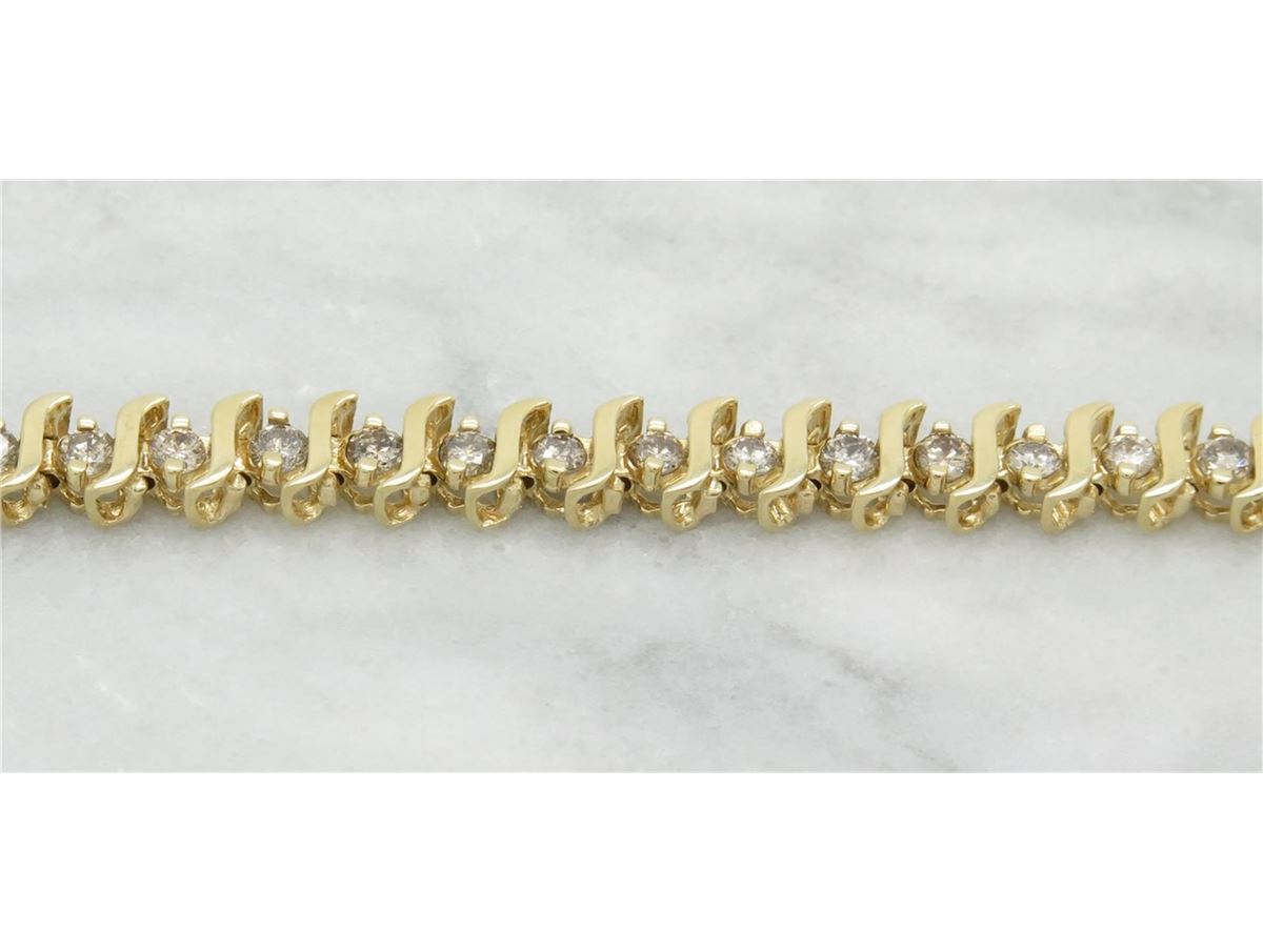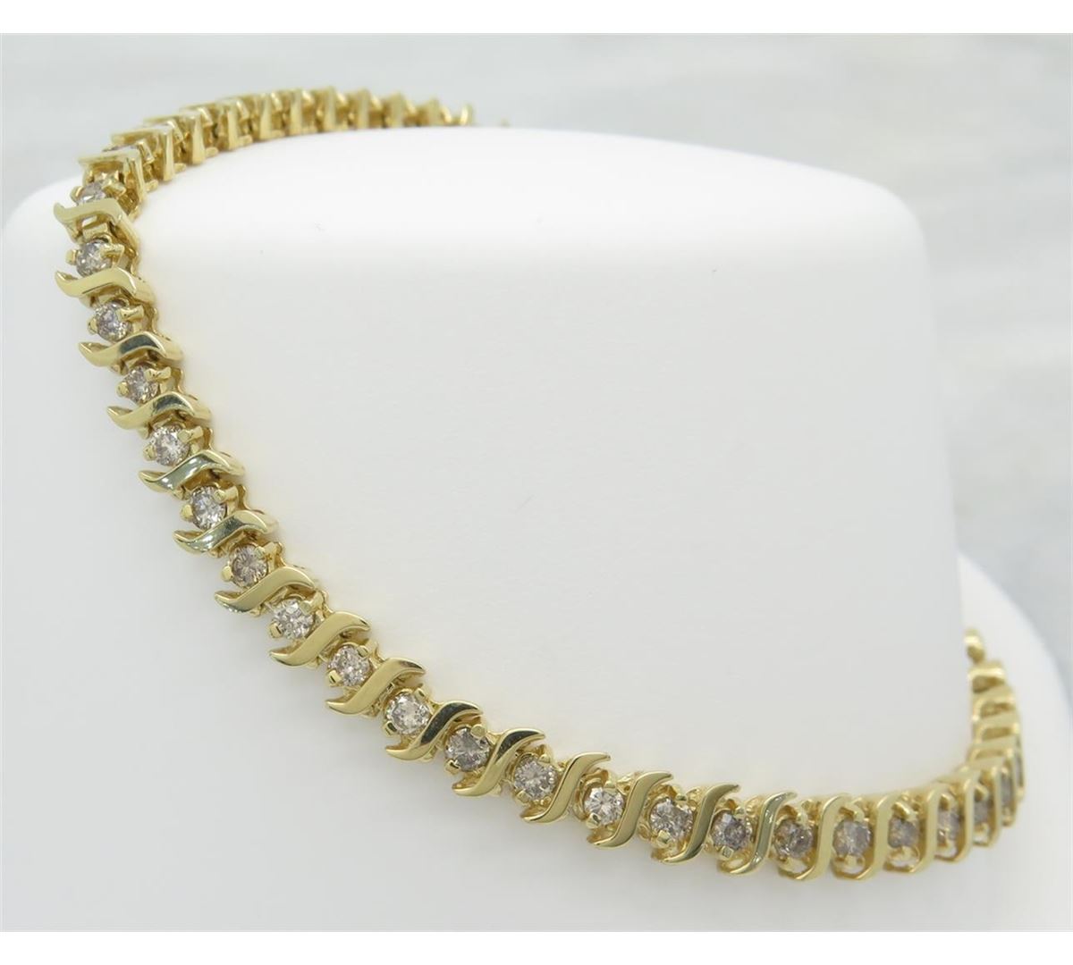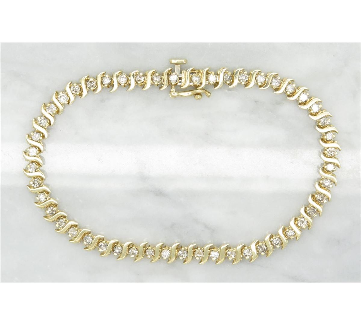 One tested 14K yellow gold diamond bracelet. Containing: 49 Round Brilliant Cut Diamonds. Clarity: I, Color: Champagne. Approximate total diamond weight: 2.00CTW. Diamonds are graded in the mounting, unless otherwise stated. Weight: 8.6 grams, Size: 7.5" long.