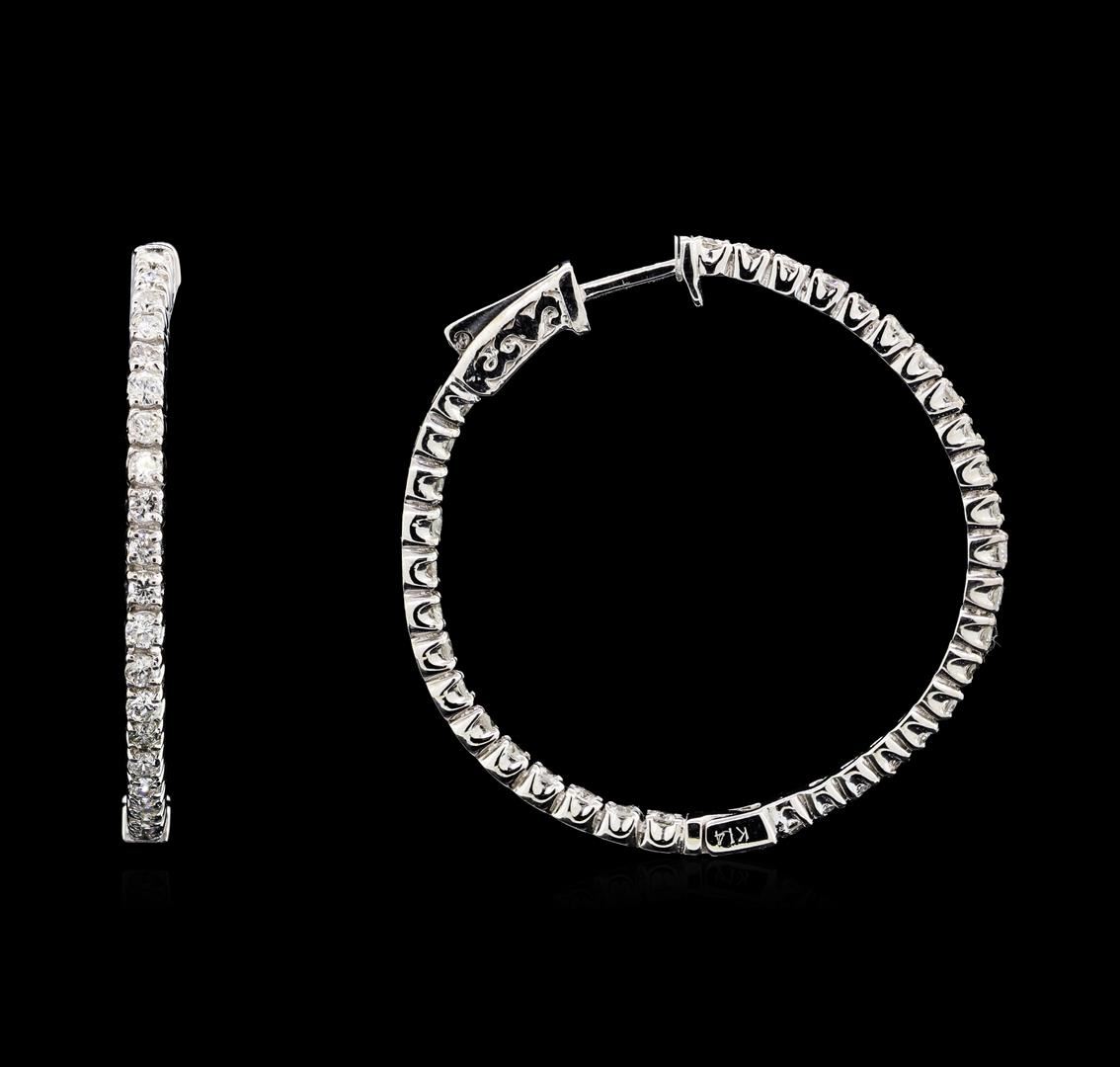 One pair electronically tested 14KT white gold lady's combination cast & assembled inside out hoop earrings with spring locking backs with a bright polish finish. The featured pair of lady's earrings measure apporximately 36 millimeters in diameter. Identified with markings of '14K'. Condition is new, good workmanship. Containing: Seventy prong set round brilliant cut diamonds, measuring 2.00 - 1.90 x 1.21mm (depth est.) approximate total weight of 70 Stones = 2.00ct. Graded in the setting. Color H - I Clarity VS-2 to SI-2 Cut Good. Total Weight of Diamonds 2.00ct.. Total Weight of Earrings 8.80gm GAS Appraised at $6500.00. GAS Appraised at $6,500.00.