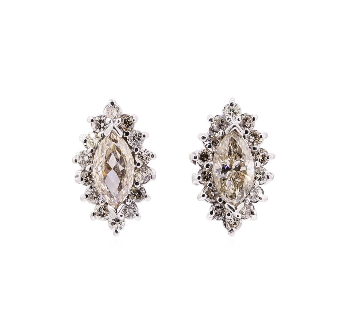 One pair electronically tested 14KT white gold lady's combination cast & assembled fashion earrings with threaded posts and screw-on/screw-off backs with a basket halo with a bright polish finish. Identified with markings of '14K'. Condition is new, good workmanship. Containing: Two prong set marquise shaped cut diamonds, measuring 8.20 x 4.48 x 3.15mm (depth est.) approximate total weight of 2 Stones = 1.35ct. Graded in the setting. Color Fancy Light Brown Clarity I-1 Cut Good Thirty-Two prong set round brilliant cut diamonds, measuring 1.80 - 1.70 x 1.09mm (depth est.) approximate total weight of 32 Stones = 0.65ct. Graded in the setting. Color I - L Clarity SI-1 to I-1 Cut Good. Total Weight of Diamonds 2.00 ct.. Total Weight of Earrings 3.70gm GAS Appraised at $5195.00. GAS Appraised.
