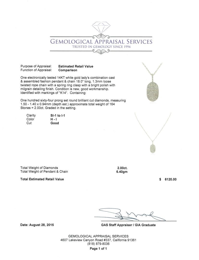 One electronically tested 14KT white gold lady's combination cast & assembled fashion pendant & chain 18.0" long, 1.3mm loose twisted rope chain with a spring ring clasp with a bright polish with milgrain detailing finish. Identified with markings of "K14". Condition is new, good workmanship. Containing: One Hundred Sixty-Four prong set round brilliant cut diamonds, measuring 1.50 - 1.40 x 0.94mm (depth est.) approximate total weight of 164 Stones = 2.00ct. Graded in the setting. Clarity: SI-1 to I-1. Color: H - I. Cut Good. Total Weight of Diamonds 2.00ct. Total Weight of Pendant & Chain 6.40gm. GAS Appraised at $6,120.00.
