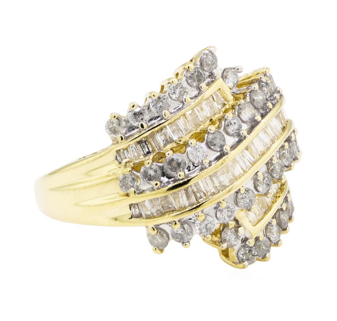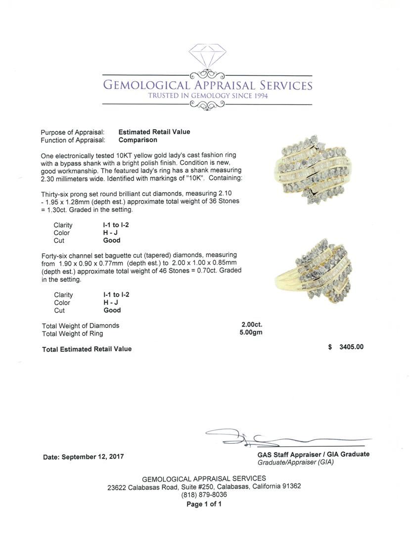 One electronically tested 10KT yellow gold lady's cast fashion ring with a bypass shank with a bright polish finish. The featured lady's ring has a shank measuring 2.30 millimeters wide. Identified with markings of '10K'. Condition is new, good workmanship. Containing: Thirty-Six prong set round brilliant cut diamonds, measuring 2.10 - 1.95 x 1.28mm (depth est.) approximate total weight of 36 Stones = 1.30ct. Graded in the setting. Color H - J Clarity I-1 to I-2 Cut Good Forty-Six channel set baguette cut (tapered) diamonds, measuring from 1.90 x 0.90 x 0.77mm (depth est.) to 2.00 x 1.00 x 0.85mm (depth est.) approximate total weight of 46 Stones = 0.70ct. Graded in the setting. Color H - J Clarity I-1 to I-2 Cut Good. Total Weight of Diamonds 2.00ct.. Total Weight of Ring 5.00gm GAS Appraised at $3405.00. GAS Appraised at $3,405.00.