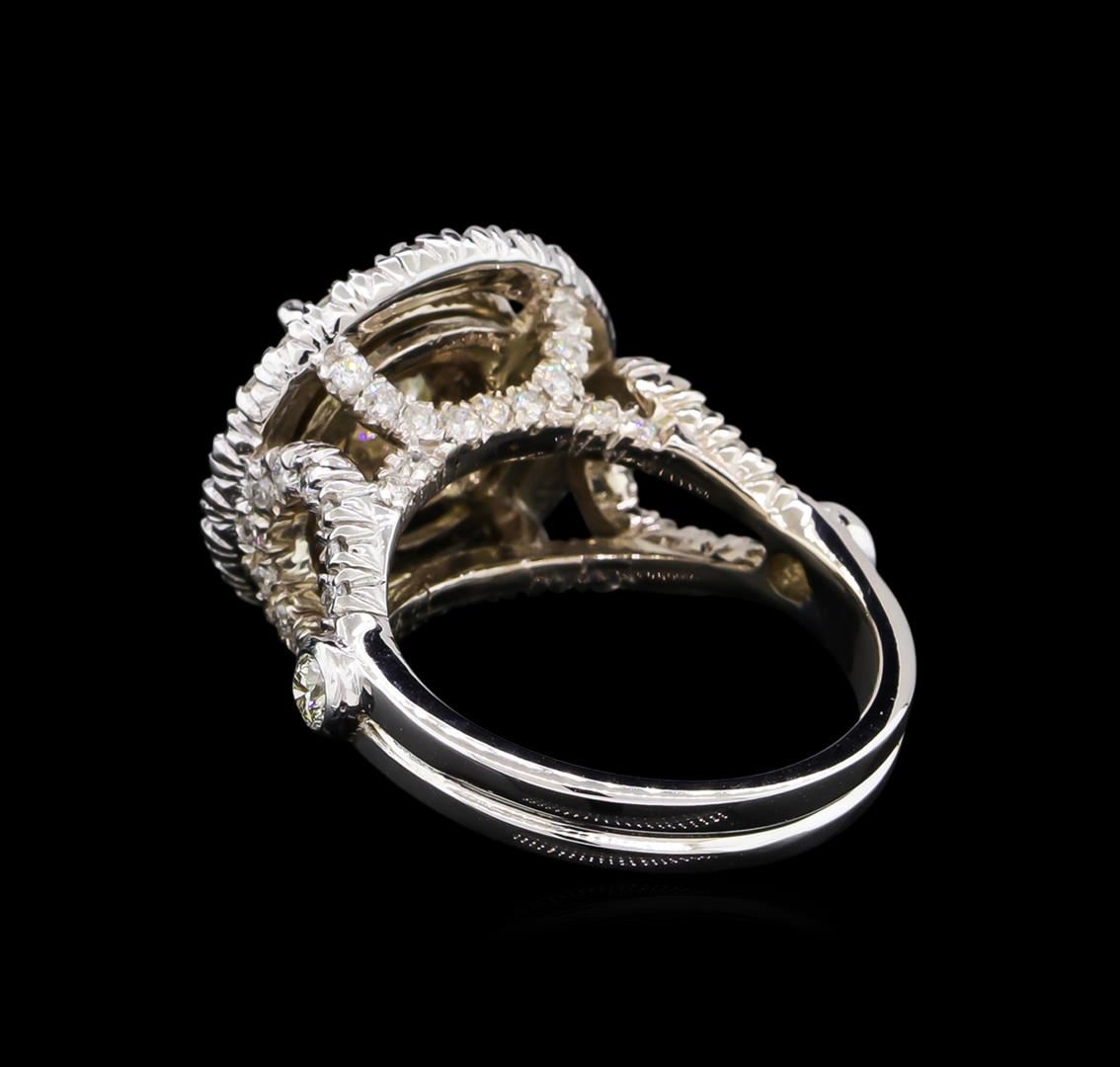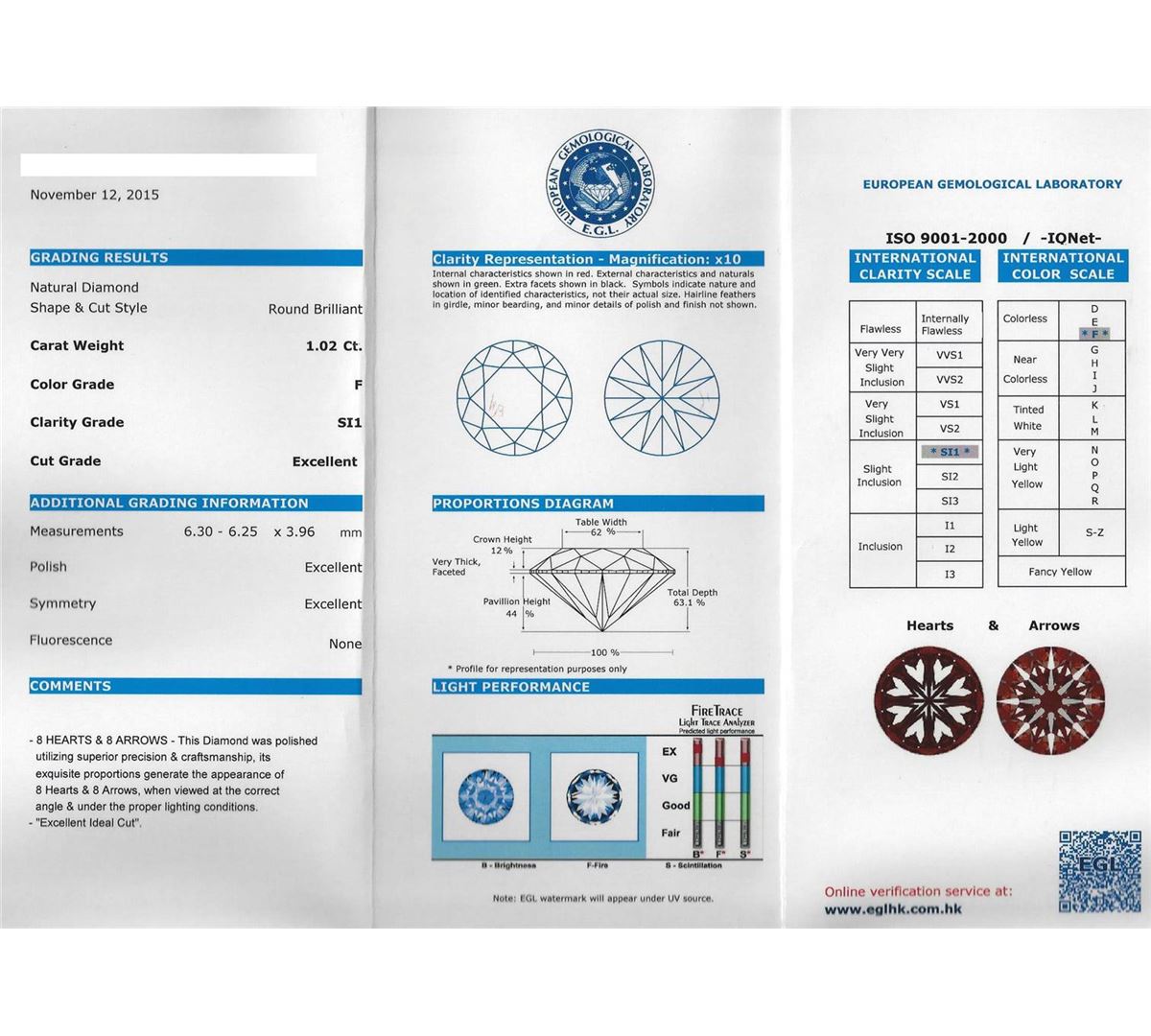 One electronically tested 14KT white gold lady's combination cast & assembled wedding ring with a cathedral shank with a double halo with a bright polish finish. The featured lady's ring has a double shank measuring 3.52 millimeters wide. Identified with markings of "14K". Condition is new, good workmanship. Containing: One prong set round brilliant cut diamond, measuring 6.30 - 6.25 x 3.96mm (depth est.) , 5.00.%. GTCF approximate weight of 1.02ct. EGL Laboratory Report #1502450624. Clarity: SI-1. Color: F. Cut Excellent Two bezel set round brilliant cut diamonds, measuring 2.60 - 2.55 x 1.63mm (depth est.) approximate total weight of 2 Stones = 0.14ct. Graded in the setting. Clarity: SI-2. Color: Good Ninety-Two prong set round brilliant cut diamonds, measuring 1.40 - 1.25 x 0.84mm (depth est.) approximate total weight of 92 Stones = 0.84ct. Graded in the setting. Clarity: SI-1 to I-1. Color: H - I. Cut Good. Total Weight of Diamonds 2.00ct. Total Weight of Ring 8.80gm. GAS Appraised at $20,635.00.