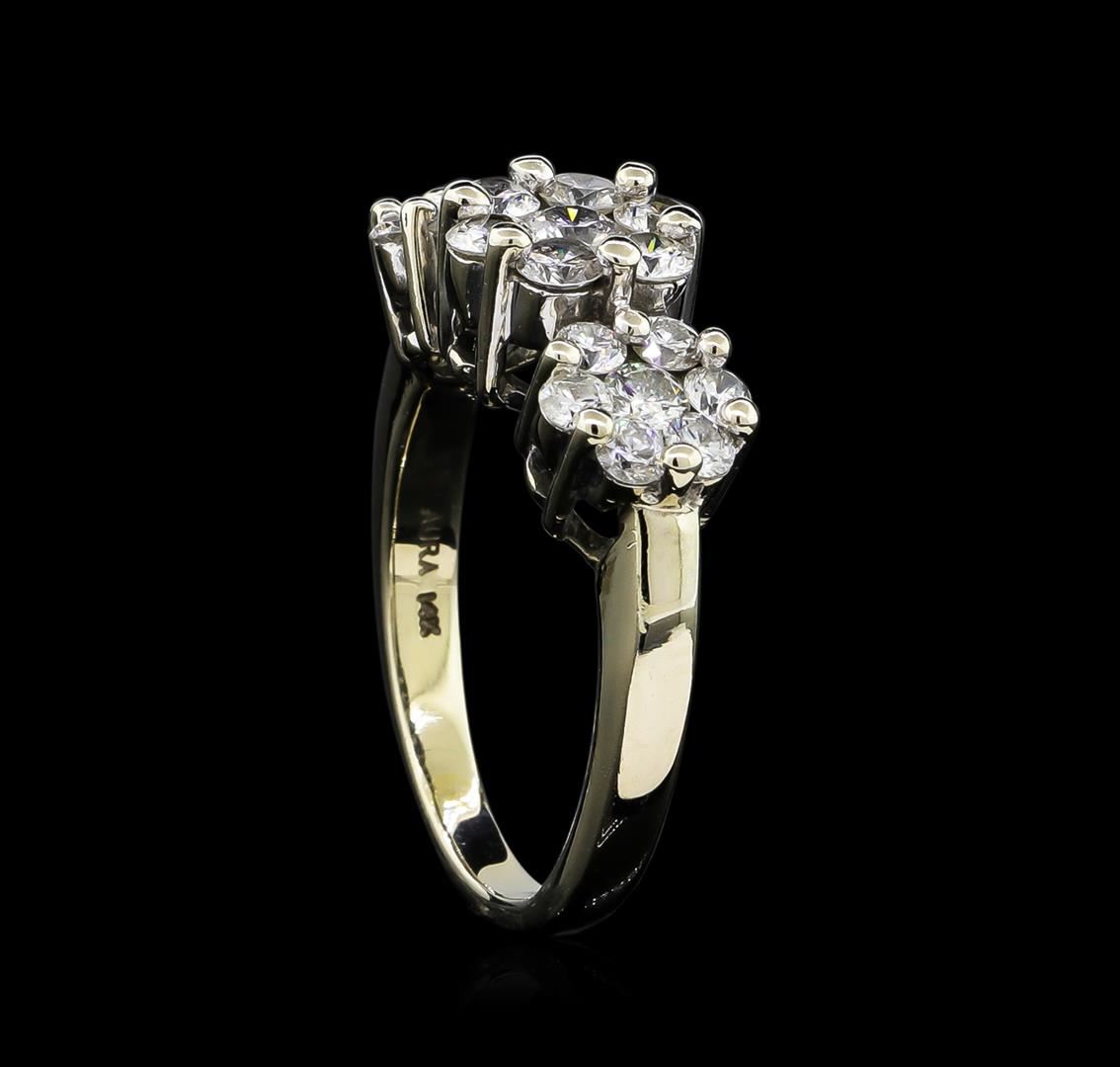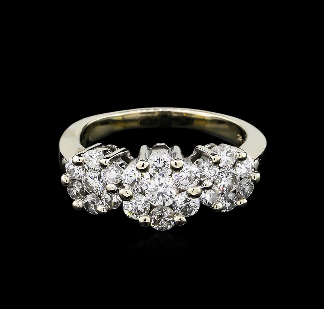 One electronically tested 14KT white gold ladies cast diamond ring with a bright polish finish. The ring features a trio of diamond floret clusters supported by a ribbed under gallery, completed by a two millimeter wide band. Trademark is AURA. Identified with markings of "14K". Condition is good. Containing: One flush set round brilliant cut diamond, measuring 3.90 - 3.90 x 2.34mm (depth est.) approximate weight of 0.25ct. Graded in the setting. Clarity: I-1. Color: H Eight prong set round brilliant cut diamonds, measuring 3.20 - 3.10 x 1.89mm (depth est.) approximate total weight of 8 Stones = 1.00ct. Graded in the setting. Clarity: SI-1 to I-1. Color: G - I Twelve prong set round brilliant cut diamonds, measuring 2.60 - 2.50 x 1.53mm (depth est.) approximate total weight of 12 Stones = 0.75ct. Graded in the setting. Clarity: SI-2 to I-1. Color: G - I. Total Weight of Diamonds 2.00ct. Total Weight of Ring 7.12gm. AIG Appraised at $6,640.00.